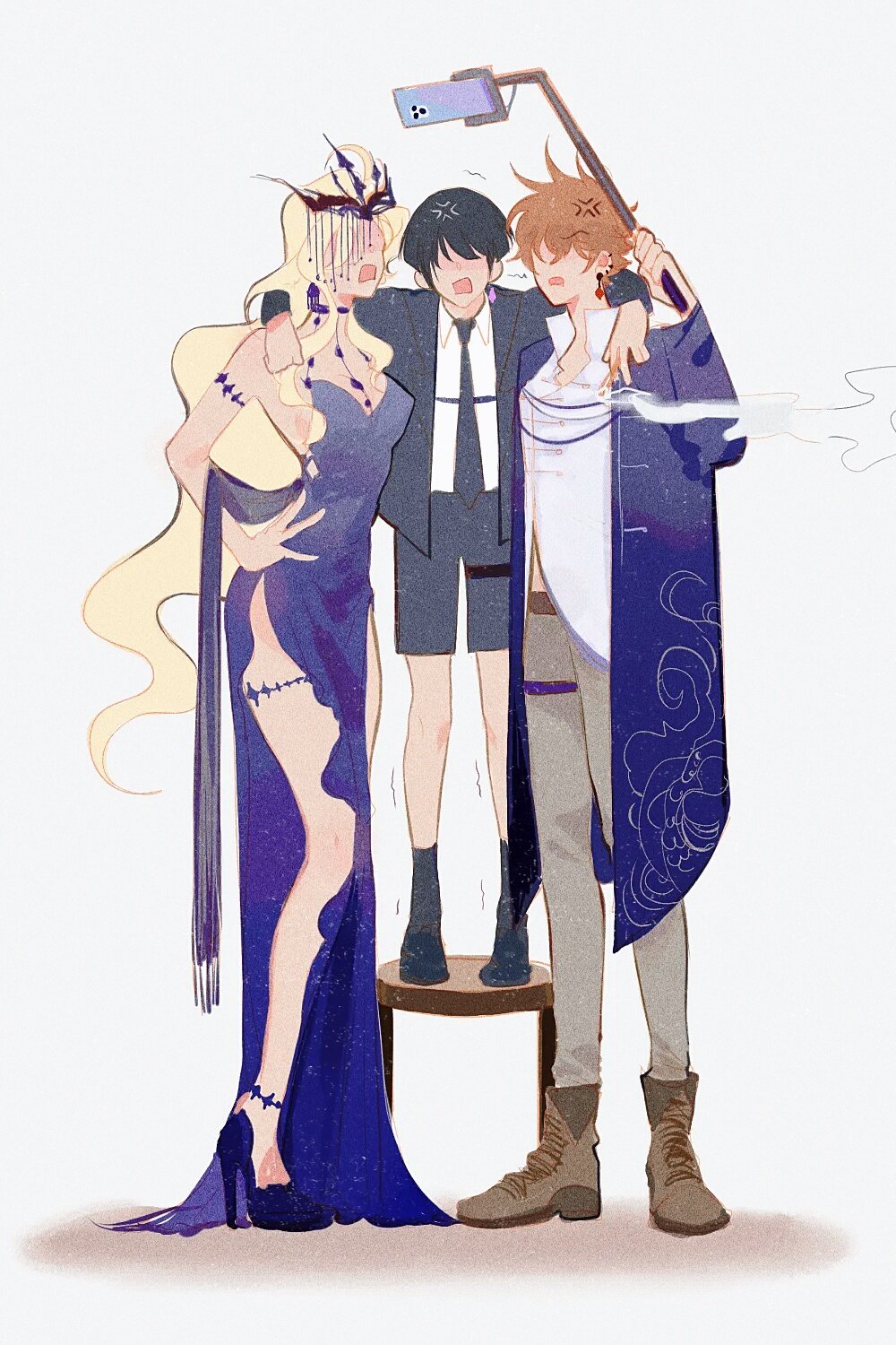1girl 2boys alternate_costume anger_vein anklet arms_on_another's_shoulder belt black_footwear black_hair black_jacket black_necktie black_shorts black_sleeves black_socks black_tiara blonde_hair blunt_ends boots breasts brown_belt brown_footwear cellphone chest_harness choker cleavage clothing_cutout collared_shirt diamond_earrings dress earrings full_body genshin_impact grey_pants hand_on_own_hip hand_up harness height_difference high_heels highres jacket jewelry knees long_hair long_sleeves midriff_peek multiple_boys necktie no_eyes on_stool open_clothes open_jacket open_mouth open_robe orange_hair pants parted_bangs phone purple_choker purple_dress purple_footwear purple_robe purple_sleeves robe scaramouche_(genshin_impact) selfie_stick shirt shoes shorts side_cutout side_slit signora_(genshin_impact) sleeveless sleeveless_dress socks standing stool suit_jacket tartaglia_(genshin_impact) thighlet tiara trembling very_long_hair white_background white_shirt wing_collar yionyi23