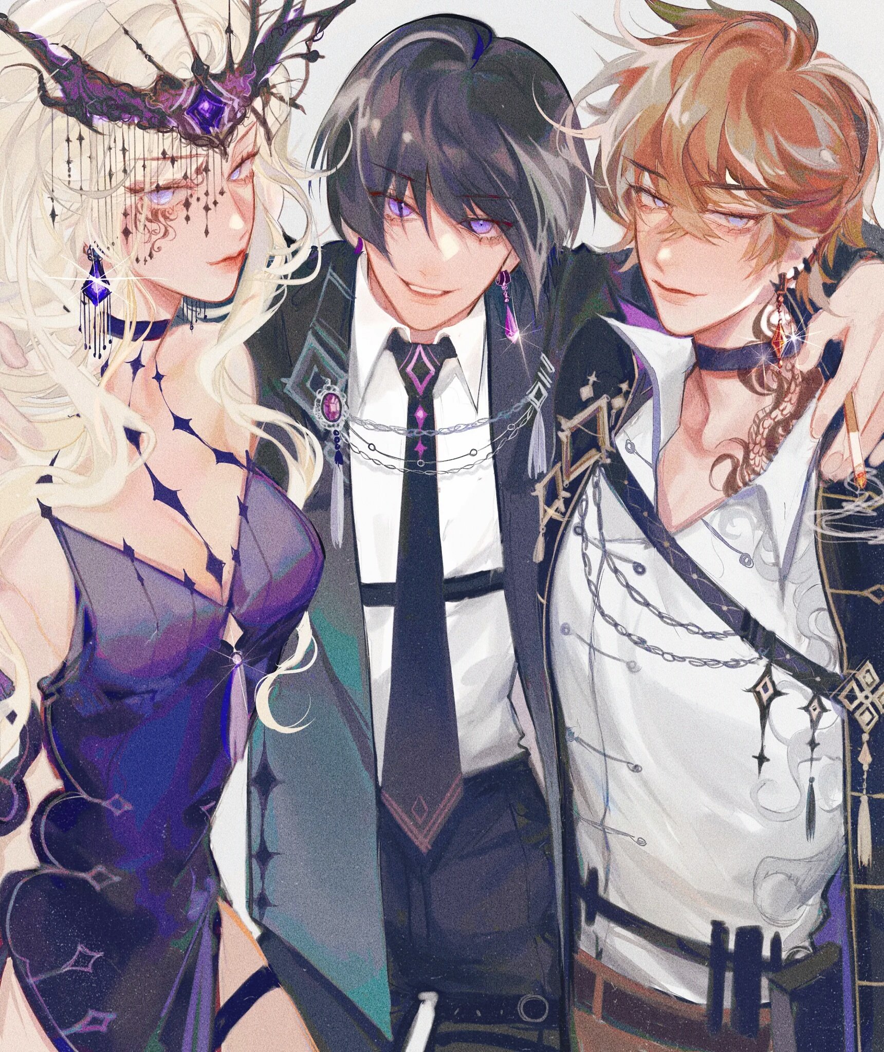 1girl 2boys aegyo_sal aiguillette alternate_costume arms_on_another's_shoulder bare_shoulders belt black_choker black_cloak black_hair black_jacket black_necktie black_pants black_tiara blonde_hair breasts brown_belt brown_pants chest_harness chest_tattoo choker cleavage cloak closed_mouth clothing_cutout collared_shirt dress ear_piercing earrings eyelashes gem genshin_impact harness head_tilt highres jacket jewelry lapels long_hair looking_at_viewer multicolored_hair multiple_boys neck_tattoo necktie open_clothes open_jacket orange_hair pants parted_lips piercing purple_dress purple_eyes purple_gem red_lips scaramouche_(genshin_impact) shirt side_cutout side_slit signora_(genshin_impact) sleeveless sleeveless_dress smile streaked_hair suit_jacket tartaglia_(genshin_impact) tassel tattoo thigh_strap tiara white_hair white_mouth white_shirt wing_collar yionyi23