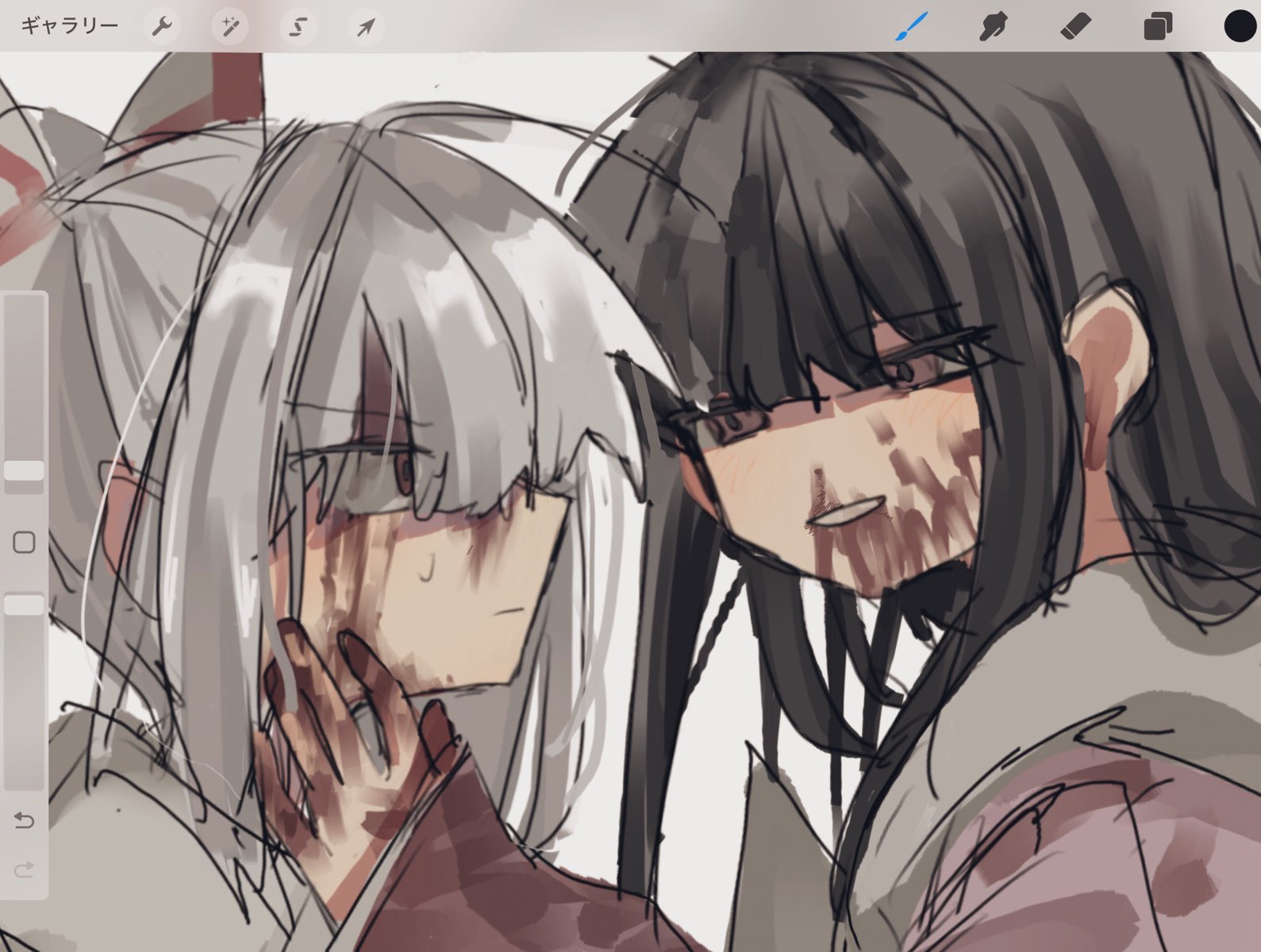 2girls black_hair blood blood_on_face blood_on_hands blunt_bangs bow fujiwara_no_mokou grey_hair hachi_6218 hair_bow hand_on_another's_face highres houraisan_kaguya long_sleeves looking_at_another multiple_girls parted_lips pink_skirt ponytail shirt sidelocks skirt smile sweat touhou white_shirt