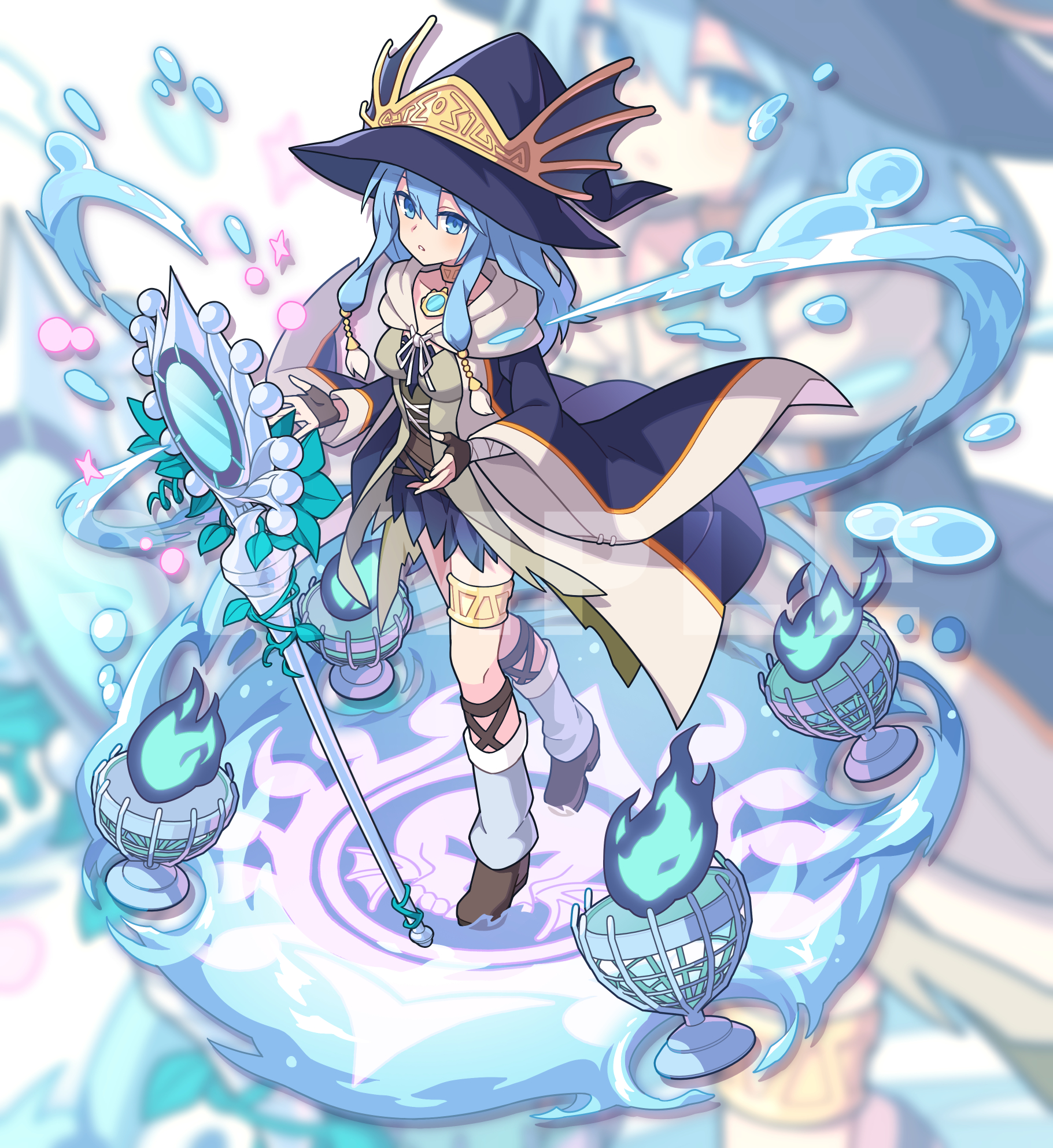 1girl ariel_(yu-gi-oh!) bandaged_arm bandages bimusama blue_eyes blue_hair choker commission duel_monster fingerless_gloves full_body gishki_ariel gloves hat highres hydrokinesis jewelry leg_warmers long_hair long_sleeves open_clothes open_robe parted_lips robe sample_watermark shoes sidelocks skirt solo staff thighlet water watermark wide_sleeves witch_hat yu-gi-oh!