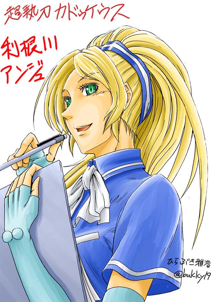 1girl arm_warmers blonde_hair blue_dress bow bowtie chou_shittou_caduceus clipboard dress facing_to_the_side gloves green_eyes hirabuki_masahiro holding holding_clipboard holding_pencil long_hair looking_to_the_side partially_fingerless_gloves pencil ponytail signature smile tonegawa_anju white_background white_bow white_bowtie