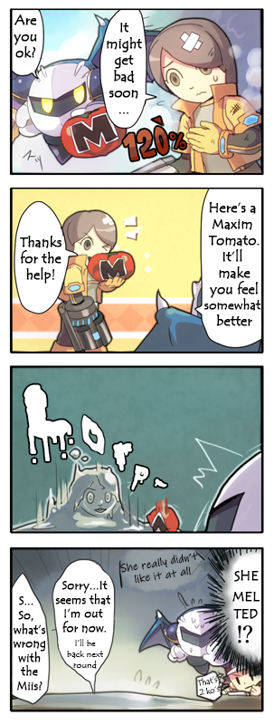 1girl 2boys ^^^ bat_wings brown_eyes brown_hair cape english_text flying_sweatdrops gameplay_mechanics gloves glowing glowing_eyes holding kirby_(series) long_hair looking_at_another mask maxim_tomato melting meta_knight mii_(nintendo) mii_gunner mii_gunner_(smash_ultimate) multiple_boys nintendo onomicha pokemon red_(pokemon) short_hair smile speech_bubble super_smash_bros. sweat sweatdrop thinking tomodachi_life weapon wings yellow_eyes