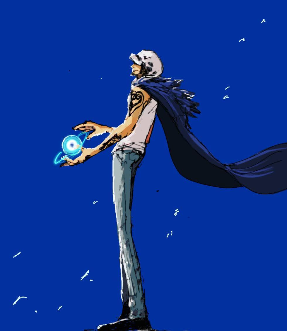 1boy arm_tattoo bare_arms bare_shoulders blue_background blue_cape cape closed_mouth cpae denim devil_fruit_power facial_hair from_side full_body fur-trimmed_cape fur_trim goatee hand_tattoo hat hat_over_eyes jeans light_particles male_focus one_piece oooooogu24 ope_ope_no_mi pants profile shirt simple_background sleeveless sleeveless_shirt smile solo standing tank_top tattoo trafalgar_law white_shirt white_tank_top