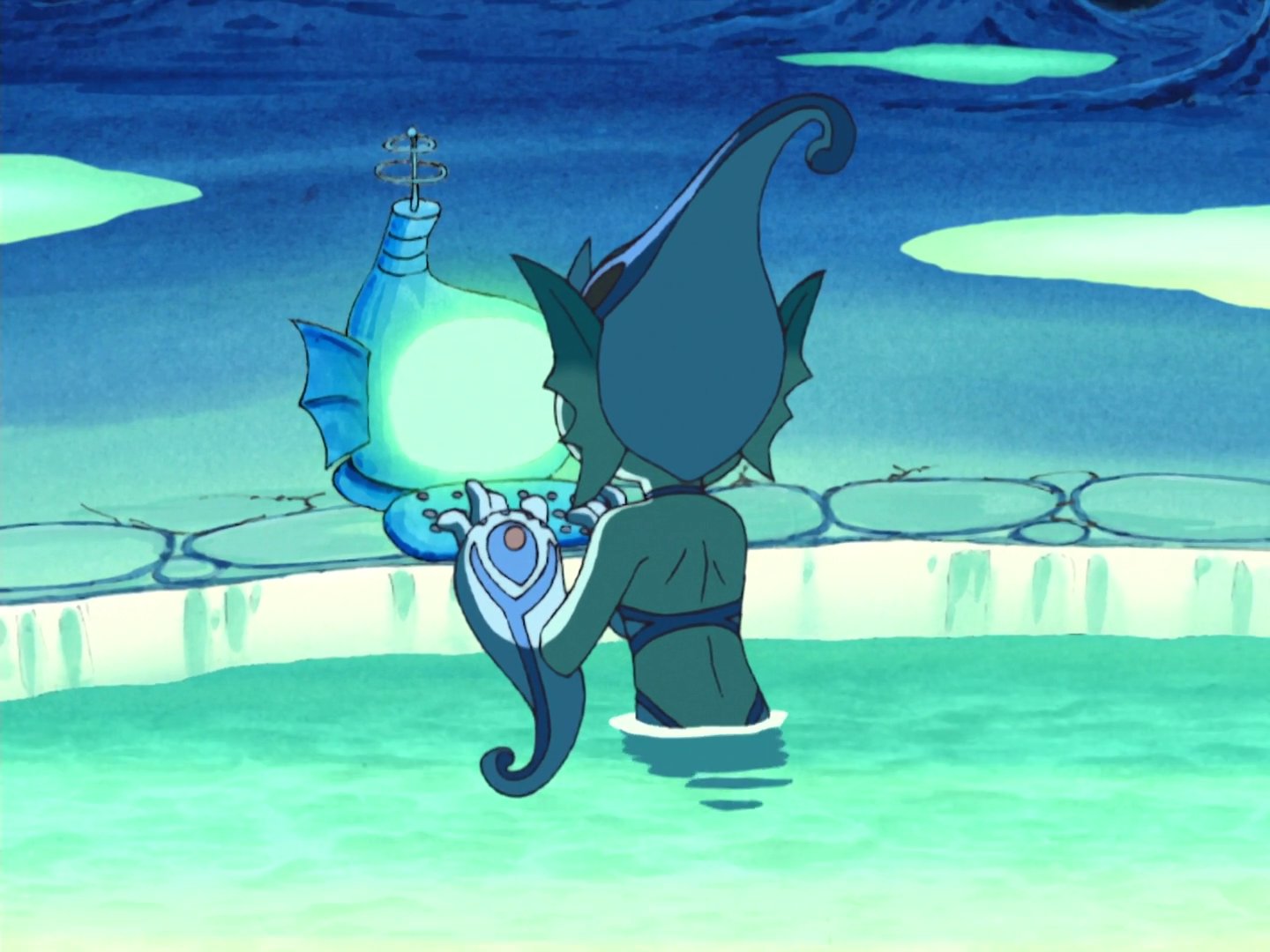 1girl anime_screenshot blue_one-piece_swimsuit digimon digimon_(creature) digimon_frontier fins helmet monster_girl one-piece_swimsuit ranamon swimsuit toei_company