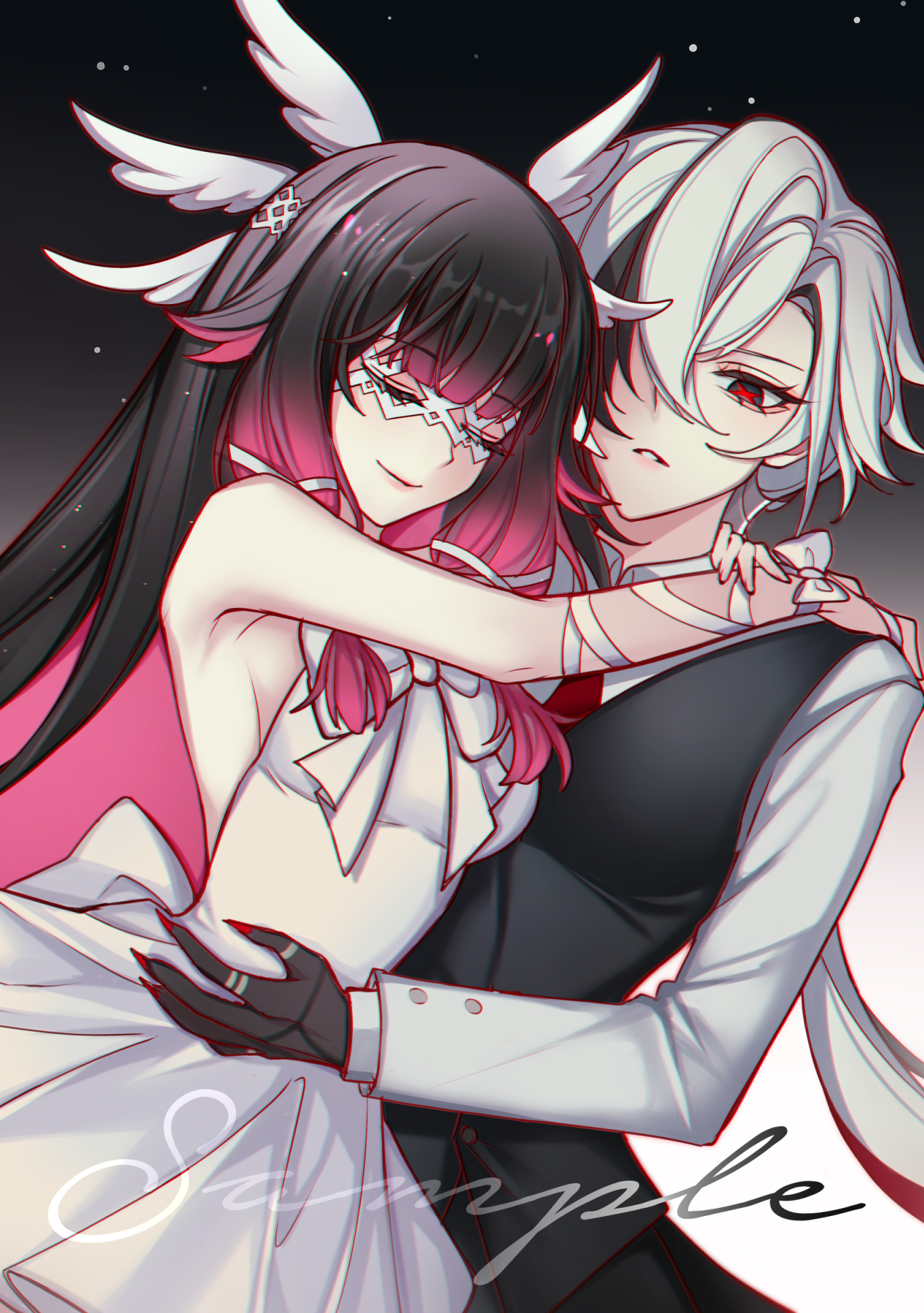 arlecchino_(genshin_impact) charlie_purrito closed_eyes columbina_(genshin_impact) couple genshin_impact head_wings highres hug long_hair looking_at_viewer original self-upload smile symbol-shaped_pupils wings x-shaped_pupils