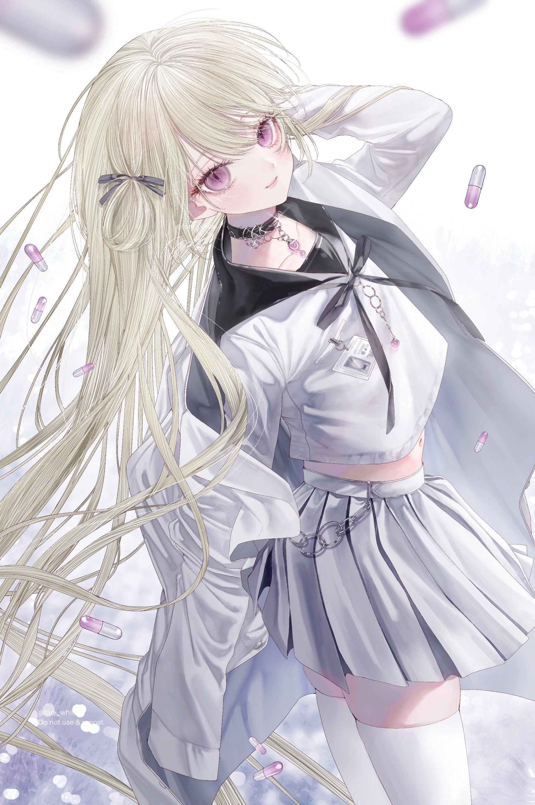 1girl absurdres black_sailor_collar blonde_hair blush choker flat_chest highres lab_coat long_hair looking_at_viewer msa_(fary_white) original phalaenopsis_(msa_(fary_white)) pill pleated_skirt purple_eyes sailor_collar shirt skirt slit_pupils smile solo thighhighs very_long_hair white_thighhighs zettai_ryouiki