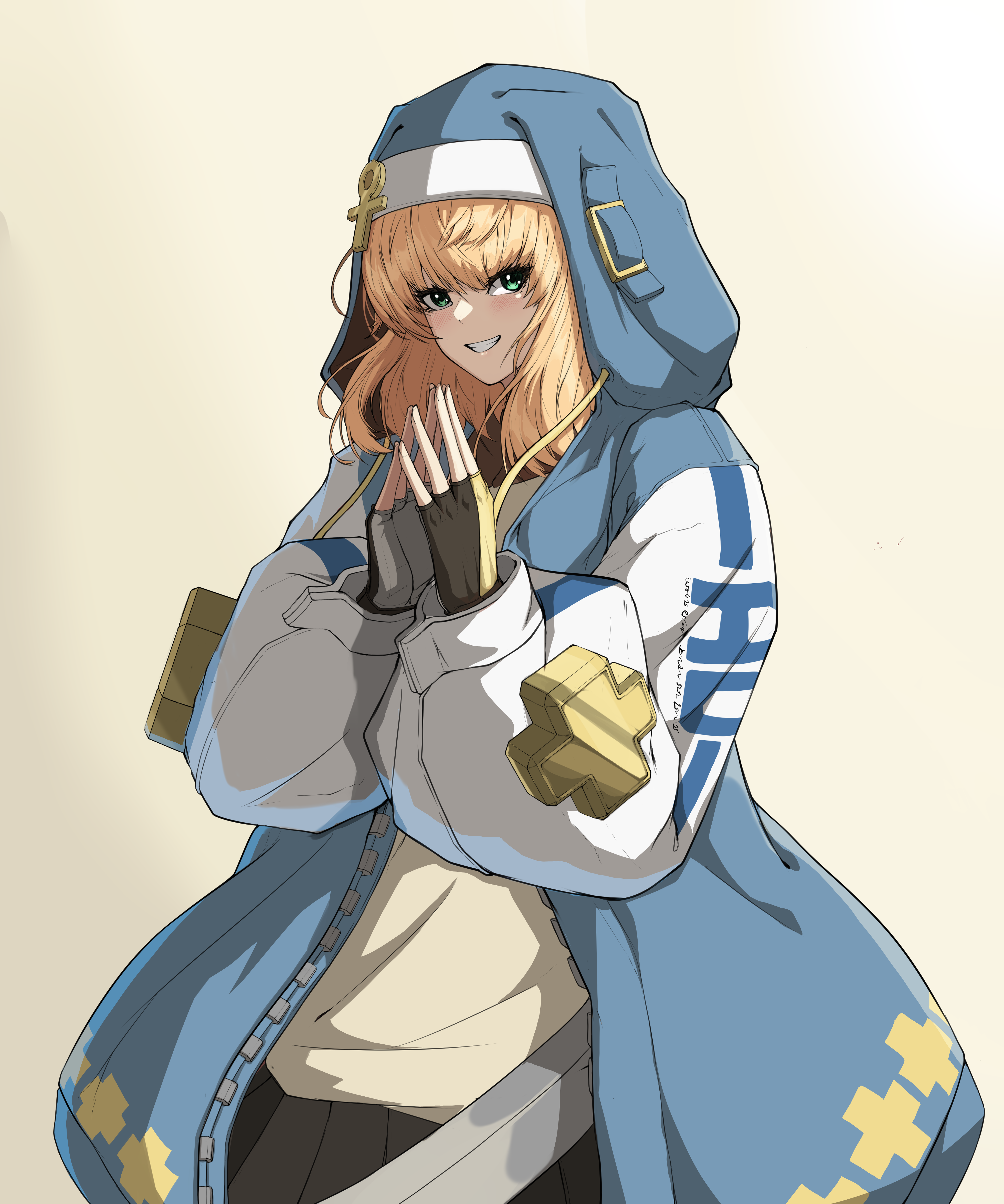 1boy absurdres aqua_eyes black_gloves black_skirt blonde_hair blue_jacket bridget_(guilty_gear) commentary commentary_request cross cuffs drimm english_commentary fingerless_gloves gloves grin guilty_gear guilty_gear_strive habit handcuffs highres hood hood_up hooded_jacket jacket korean_commentary looking_at_viewer medium_hair mixed-language_commentary own_hands_together simple_background skirt smile solo trap venus_symbol yellow_background