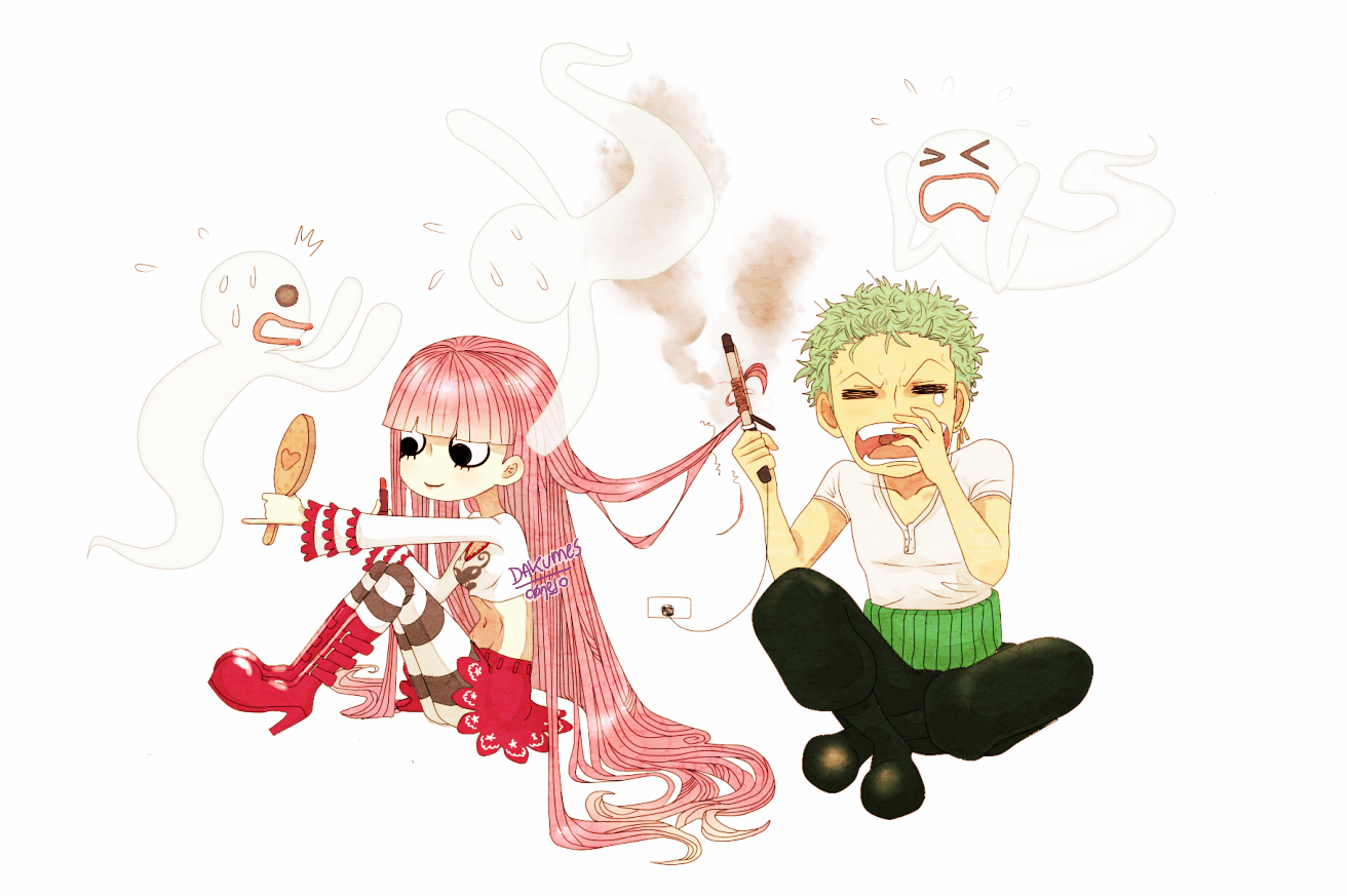 1boy 1girl artist_name black_pants blunt_bangs boots burning burning_hair commentary cosmetics crop_top dakumes earrings ghost green_hair hair_straightener haramaki high_heel_boots high_heels holding holding_hair_straightener holding_lipstick_tube holding_mirror jewelry lipstick_tube long_hair mirror one_piece pants perona pink_hair roronoa_zoro shirt simple_background sitting skirt smile striped_clothes striped_thighhighs sweatdrop thighhighs white_background white_shirt yawning