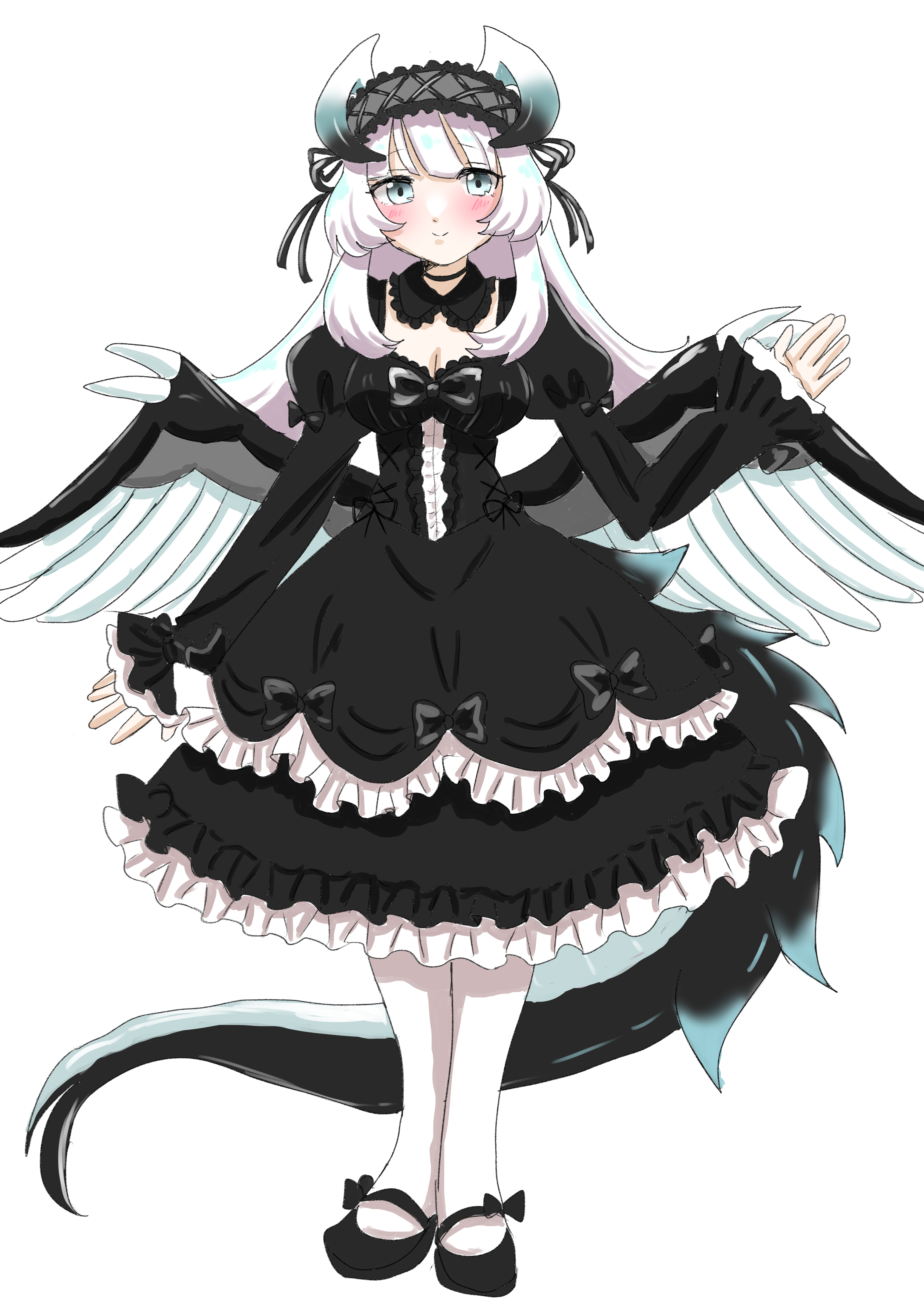 1girl absurdres black_dress black_shoes blush breasts chamber_dragonmaid cleavage closed_mouth dragon_girl dragon_horns dragon_tail dress duel_monster feathered_wings full_body gothic_lolita highres horns light_blush lolita_fashion long_hair long_sleeves maid maid_headdress namenekorin shoes simple_background smile solo tail white_background white_eyes wings yu-gi-oh!