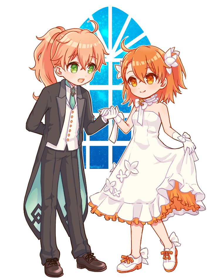 1boy 1girl :d ahoge alternate_costume arm_behind_back artist_name bare_shoulders black_coat black_pants bow brown_footwear chaldea_logo closed_mouth coat coattails collared_shirt colored_shoe_soles commentary_request couple deformed dress fate/grand_order fate_(series) flower footwear_bow frilled_dress frills fujimaru_ritsuka_(female) fujimaru_ritsuka_(female)_(fgo_orchestra) full_body gloves green_eyes green_necktie hair_between_eyes hair_flower hair_ornament hetero holding_hands holding_own_dress layered_dress long_dress long_hair looking_at_another necktie official_alternate_costume one_side_up open_clothes open_coat open_mouth orange_eyes orange_hair pants petticoat pink_hair ponytail romani_archaman shirt shoes simple_background smile standing strapless strapless_dress tailcoat twitter_username vest waka_(owakao_f) white_background white_bow white_dress white_flower white_footwear white_gloves white_shirt white_vest window wing_collar wrist_bow