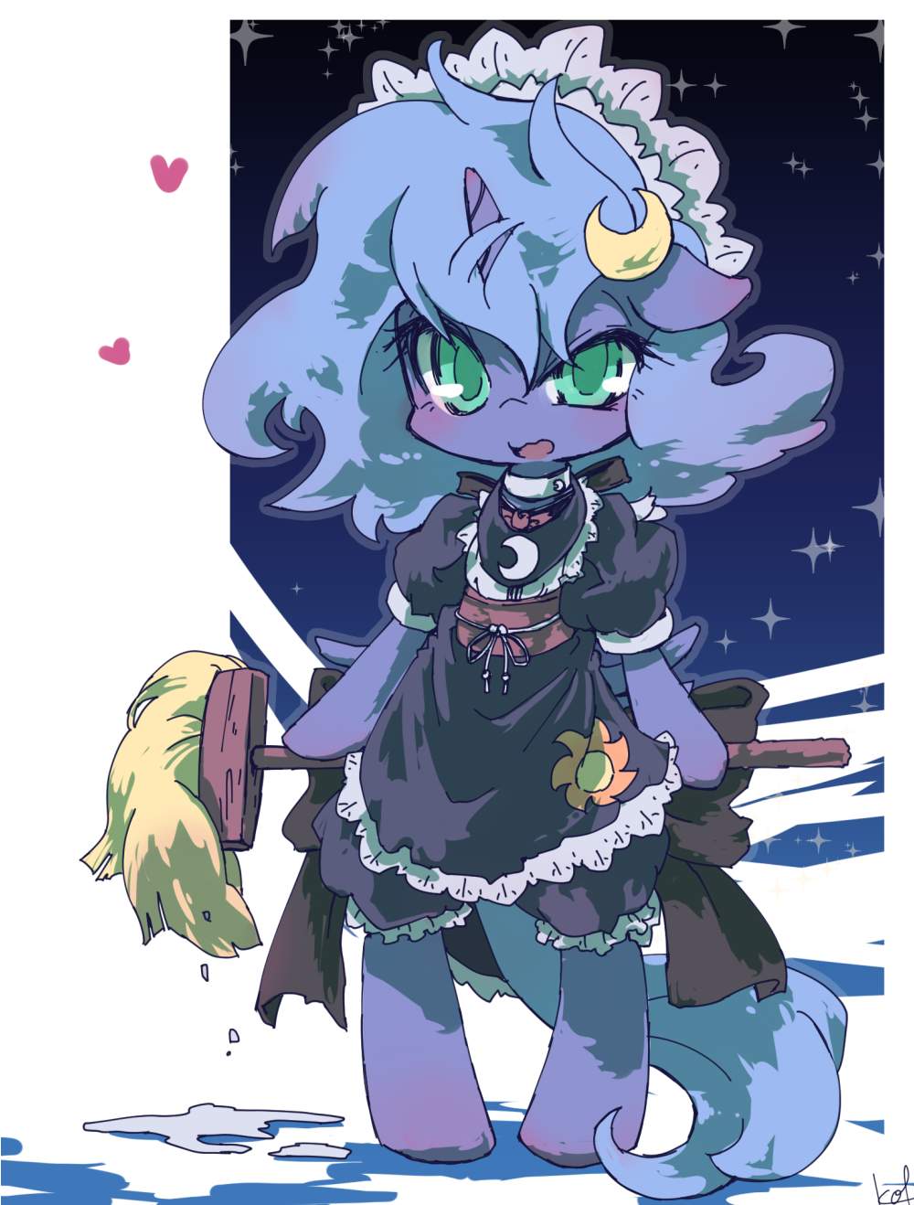 1girl black_dress blue_hair blue_tail commentary dress english_commentary full_body furry green_eyes heart highres holding holding_mop horns horse_girl kolshica maid maid_headdress medium_hair mop my_little_pony my_little_pony:_friendship_is_magic open_mouth princess_luna short_sleeves solo standing water white_headdress