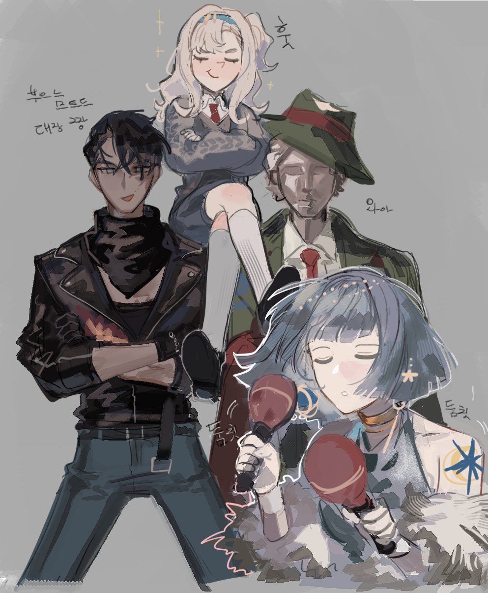 2boys 2girls :d bare_shoulders black_footwear black_hair black_jacket black_neckerchief blue_hairband blue_pants closed_eyes coat collared_shirt crossed_arms crossed_legs feather_boa fedora gold_choker green_coat green_hat grey_background grey_hair grey_shorts grey_sweater grey_tank_top hairband hat highres holding holding_instrument holding_maracas ing_(ing205509) instrument jacket j_(reverse:1999) kneehighs korean_text leather leather_jacket legs_apart mannequin maracas matilda_bouanich mercuria_(reverse:1999) multiple_boys multiple_girls neckerchief necktie on_shoulder one_side_up open_mouth pants pioneer_(reverse:1999) red_necktie reverse:1999 shirt short_hair shorts shoulder_tattoo sitting sitting_on_shoulder smile socks sweater tank_top tattoo translation_request white_shirt white_socks