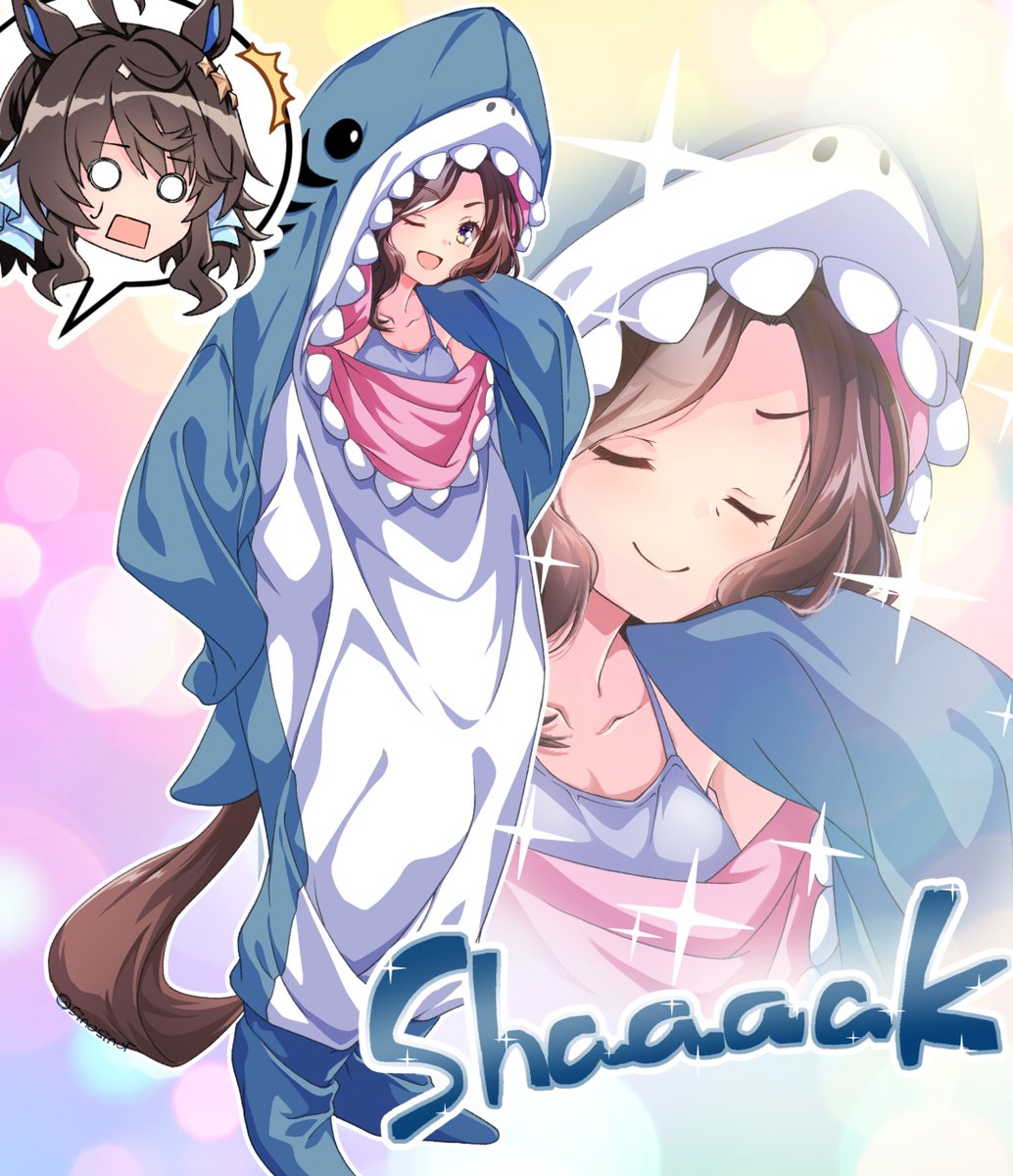 2girls ahoge alternate_costume animal_costume animal_ears black_hair breasts brown_eyes brown_hair collarbone commentary_request daring_heart_(umamusume) daring_tact_(umamusume) english_text full_body hair_between_eyes hair_ornament highres horse_girl long_hair looking_at_viewer medium_breasts multiple_girls one_eye_closed open_mouth shark_costume shinohara_shinome smile sparkle surprised umamusume