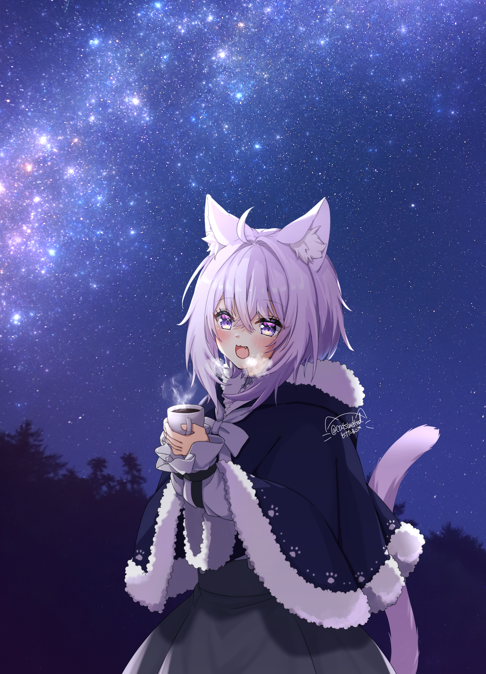 1girl ahoge animal_ear_fluff animal_ears artist_logo black_capelet blush capelet cat_ears cat_girl cat_tail cup fang fur-trimmed_capelet fur_trim grey_skirt highres holding holding_cup hololive logo long_sleeves nekomata_okayu open_mouth paw_print purple_eyes purple_hair skirt sky solo star_(sky) starry_sky tail toketa_neko virtual_youtuber
