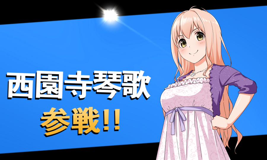 1girl blonde_hair blue_background blush breasts character_name closed_mouth collarbone commentary dress flower flower_necklace idolmaster idolmaster_cinderella_girls jewelry large_breasts letterboxed long_hair looking_at_viewer necklace nintendo outside_border saionji_kotoka smile solo super_smash_bros. translation_request white_dress yellow_eyes yoyomura