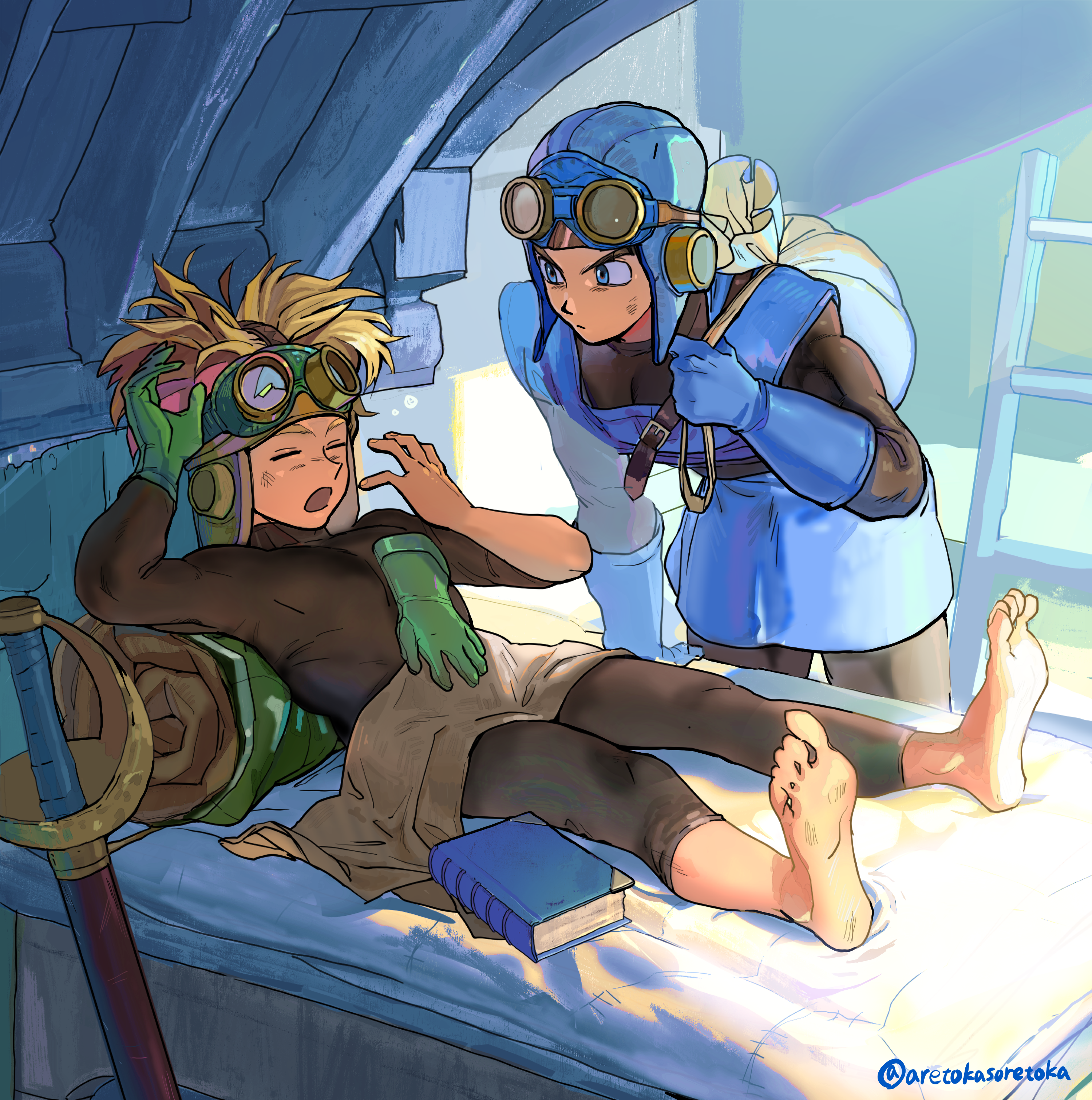 2boys absurdres aretokasoretoka bag barefoot black_bodysuit blonde_hair blue_eyes blue_gloves blue_hat blue_tunic bodysuit book closed_eyes commentary_request cousins dirty dirty_face dirty_feet dragon_quest dragon_quest_ii gloves goggles goggles_on_headwear green_gloves hat highres indoors ladder looking_at_another male_focus multiple_boys on_bed open_mouth prince_of_lorasia prince_of_samantoria single_glove sitting spiked_hair sword toned toned_male tunic unworn_gloves weapon yawning
