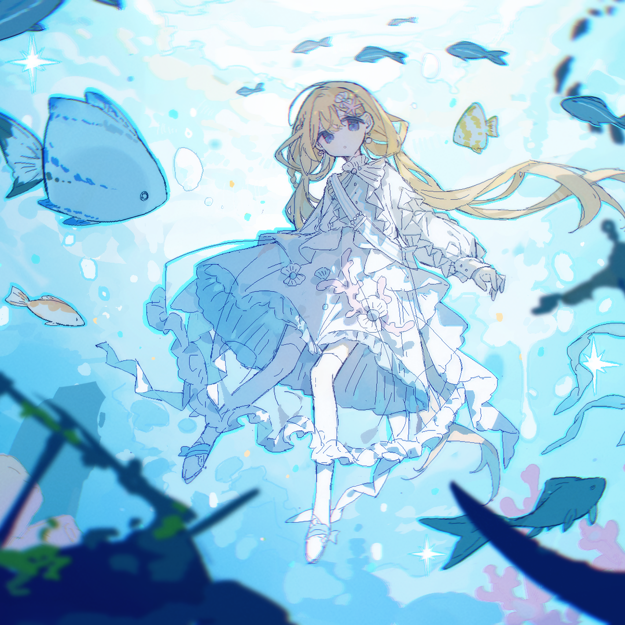 1girl ameru_nya bad_link bad_lofter_link blonde_hair blue_eyes blurry bow bubble child dress fish frilled_dress frills full_body gloves hair_ornament highres jewelry long_hair long_sleeves looking_at_viewer low_twintails original puffy_long_sleeves puffy_sleeves purple_eyes slim_legs solo thighhighs twintails underwater very_long_hair white_bow white_dress white_footwear white_gloves white_thighhighs
