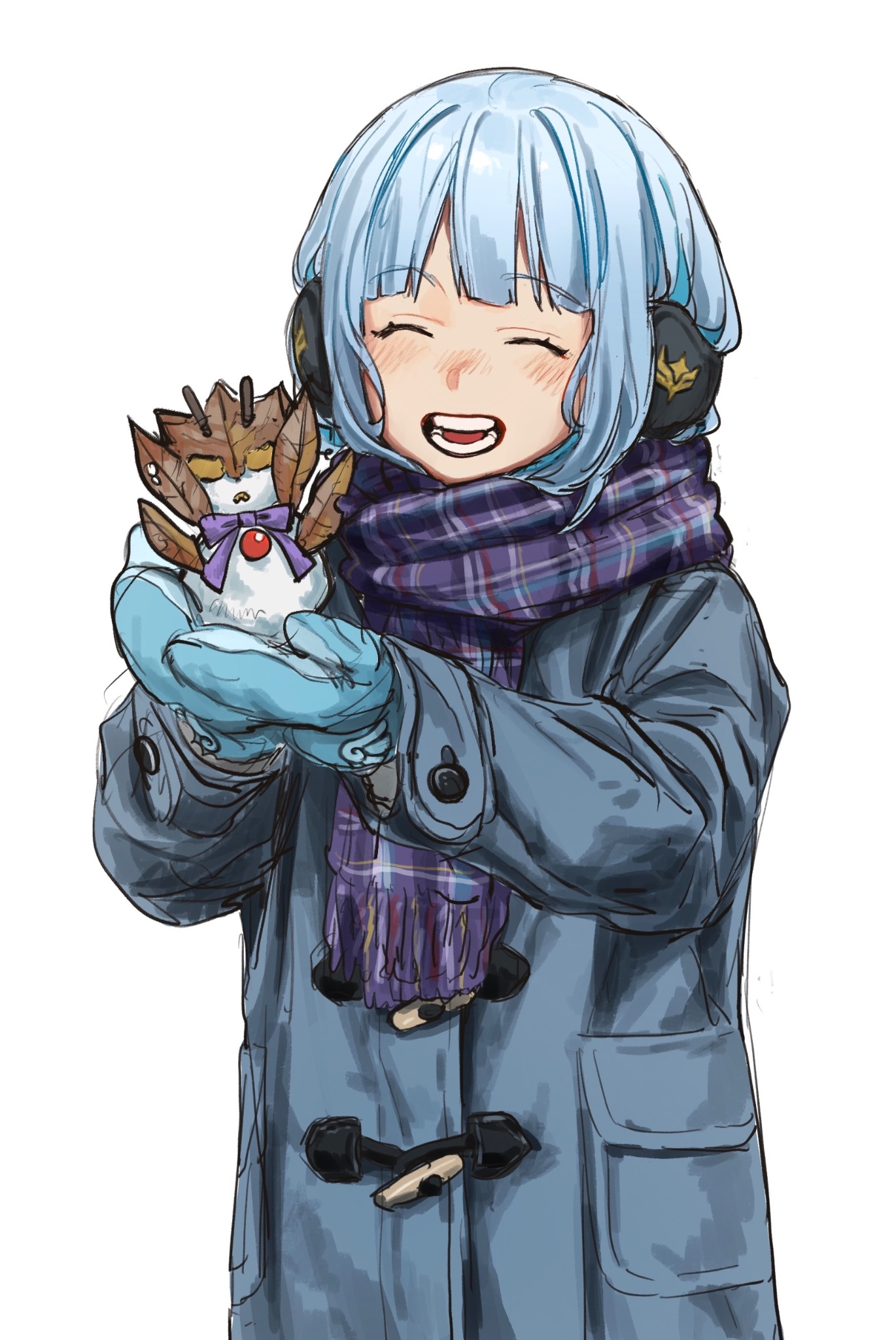 1girl 53_(kanimisomrmr) blue_hair closed_eyes coat commentary_request duffel_coat earmuffs gloves highres holding holding_snowman lulu_(bang_bravern) mini_snowman scarf simple_background smile snowman solo teeth white_background winter_clothes yuuki_bakuhatsu_bang_bravern