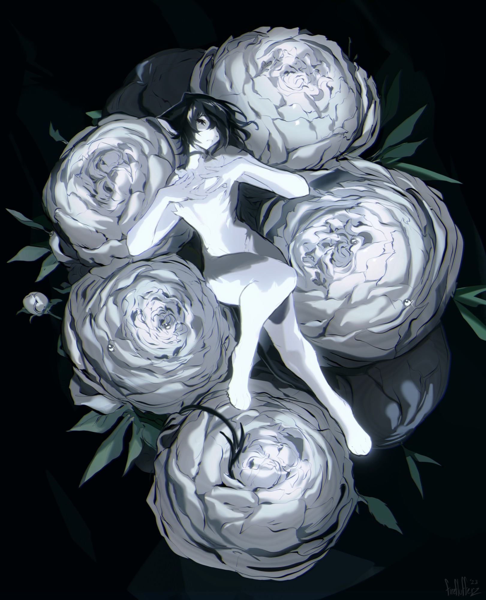 1girl black_choker black_hair cat_girl choker colored_skin flower frown highres leaf looking_at_viewer original sio_(fireflufferz) white_flower white_skin