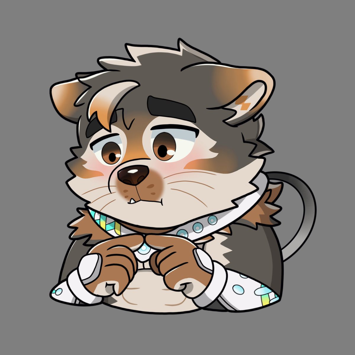 1boy animal_ears blush brown_eyes brown_fur chibi closed_mouth commentary dog_boy dog_ears animal_nose english_commentary fang furry gauntlets grey_background highres hood hooded_jacket jacket live_a_hero looking_down male_focus shirt shy sterio_(live_a_hero) thick_eyebrows whiskers yojanmarrion