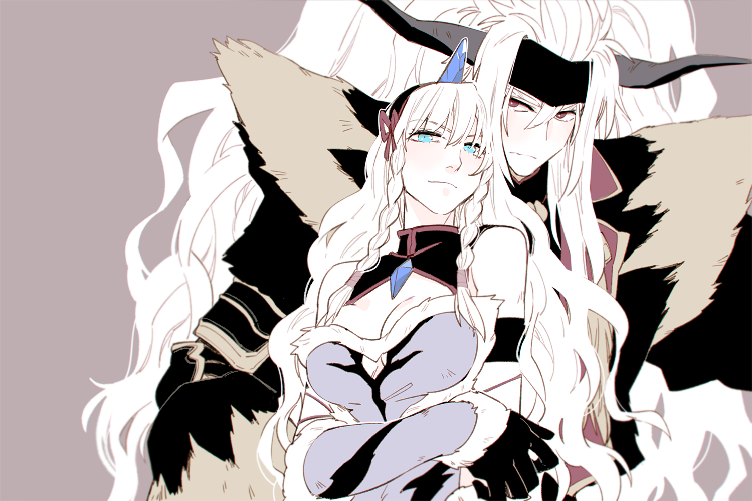 1boy 1girl bare_shoulders big_hair blue_eyes braid brown_background cleavage_cutout clothing_cutout company_connection fake_horns frown hair_between_eyes horns khirzava kirin_(armor) kyougoku_maria_(sengoku_basara) long_hair monster_hunter:_world monster_hunter_(series) rajang_(armor) red_eyes sanada_nobuyuki_(sengoku_basara) sengoku_basara side_braids simple_background smirk white_hair