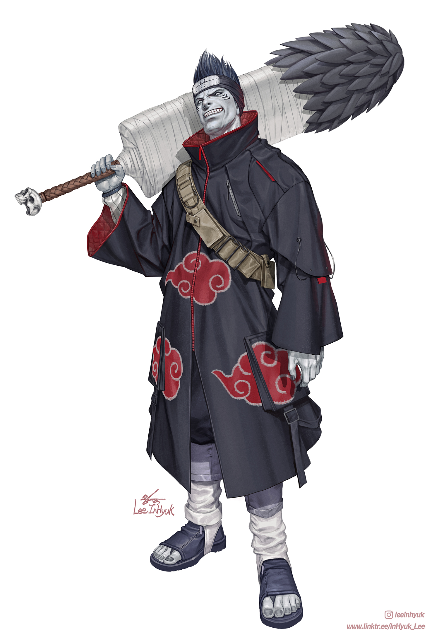 1boy akatsuki_uniform black_robe cloud_print colored_skin forehead_protector full_body grey_skin grin highres hoshigaki_kisame in-hyuk_lee kirigakure_symbol male_focus naruto_(series) robe samehada_(naruto) sandals shark_boy sharp_teeth simple_background smile standing teeth white_background zipper