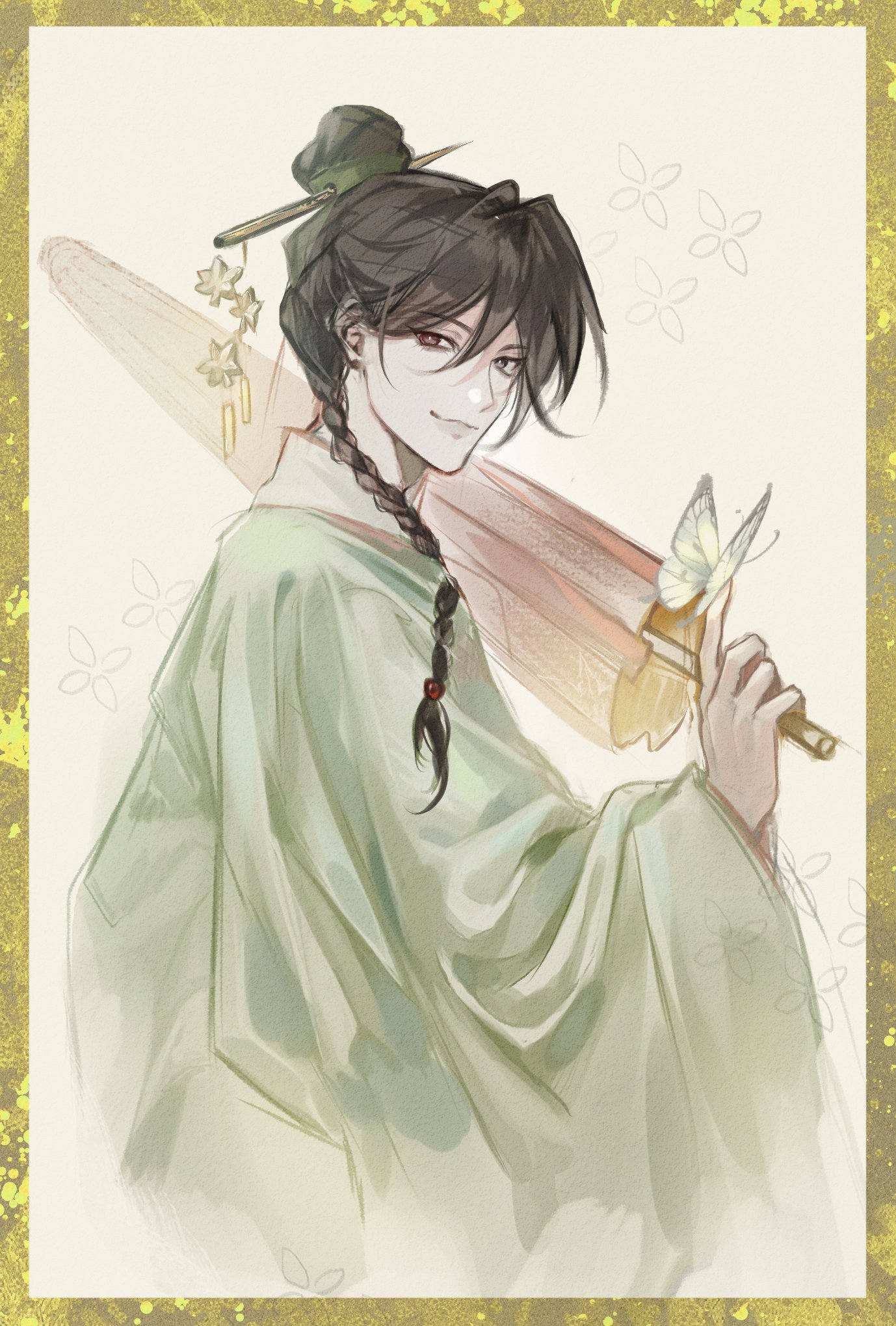 1boy black_hair braid bug butterfly butterfly_on_hand chinese_clothes chinese_hairpin closed_mouth closed_umbrella gold_border green_hanfu grey_eyes hair_bun hanfu heterochromia highres holding holding_umbrella hua_cheng insect korean_commentary lerira9 long_hair long_sleeves looking_at_viewer male_focus official_alternate_costume oil-paper_umbrella red_eyes red_umbrella single_braid single_hair_bun smile solo tianguan_cifu umbrella upper_body wide_sleeves