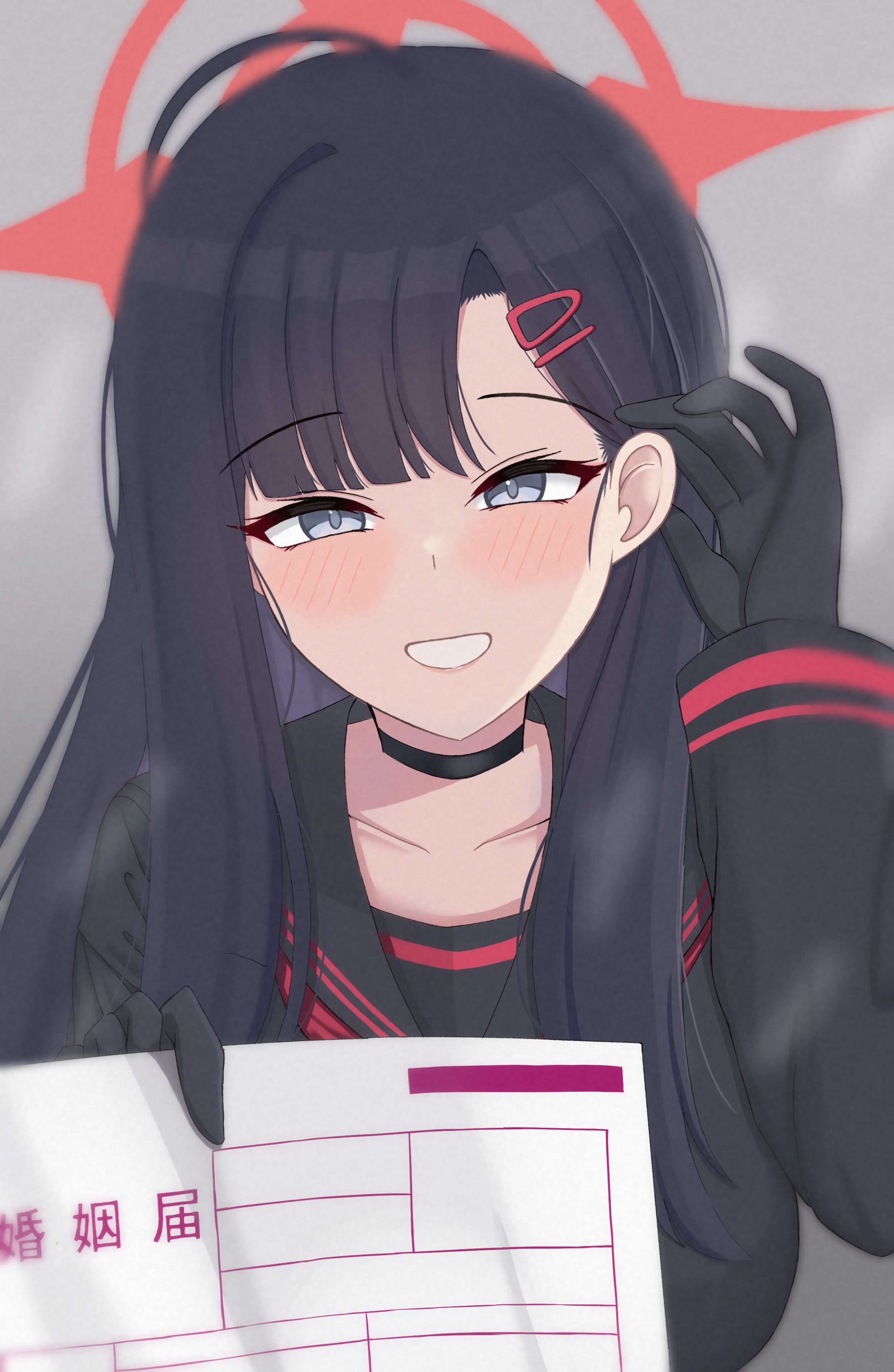 1girl :d absurdres black_gloves black_hair black_sailor_collar black_shirt blue_archive blunt_bangs blush commentary eyelashes gloves grey_background grey_eyes grin hair_behind_ear hair_ornament hairclip halo hand_up highres holding holding_paper ichika_(blue_archive) long_hair long_sleeves looking_at_viewer marriage_certificate_(object) open_mouth paper red_halo sailor_collar school_uniform serafuku shirt simple_background smile solo straight_hair tsurime upper_body woodhxx