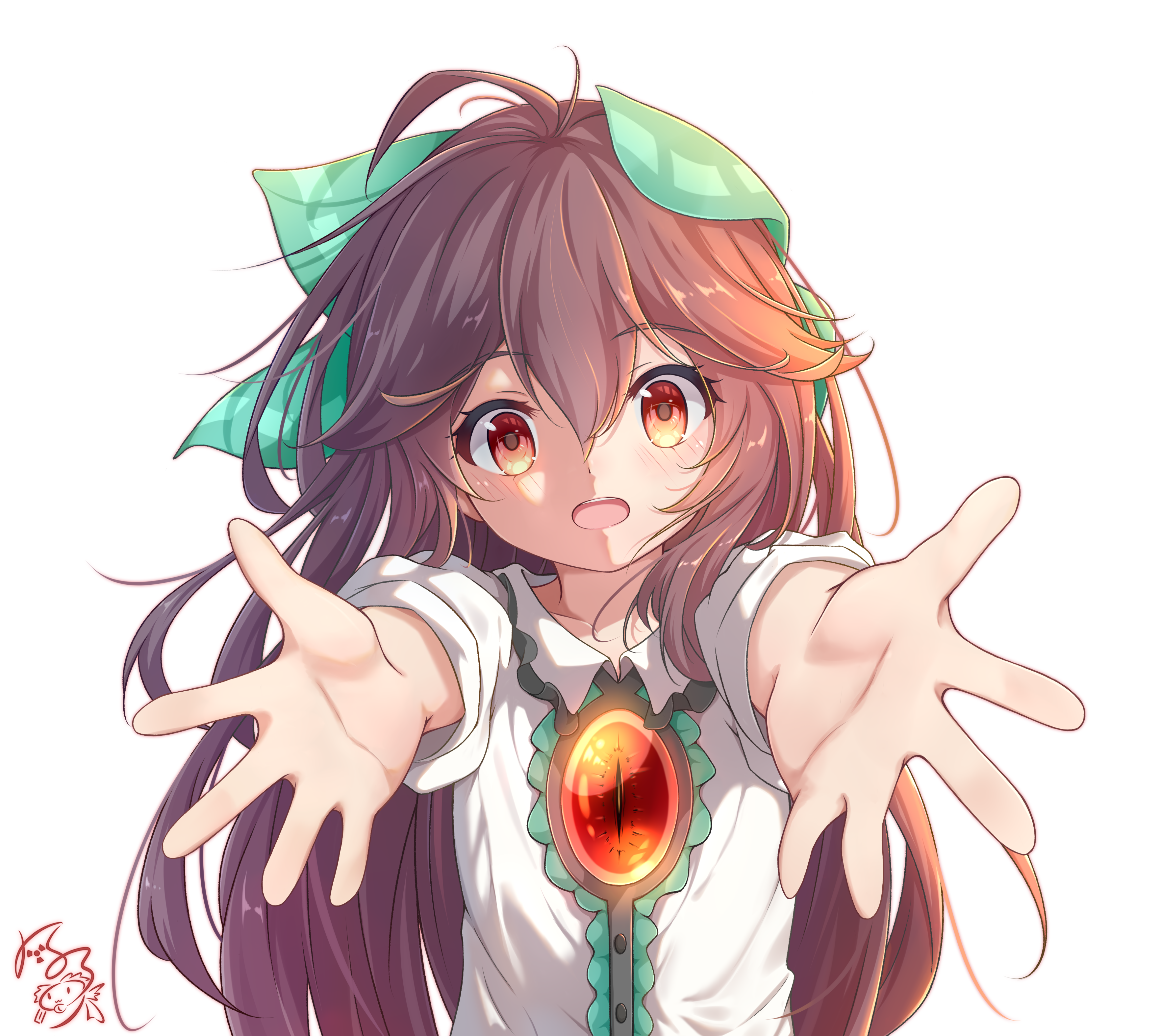 1girl absurdres blush bow brown_eyes brown_hair collared_shirt commentary_request feng_ling_(fenglingwulukong) frilled_shirt_collar frills green_bow hair_bow highres long_hair looking_at_viewer open_mouth reaching reaching_towards_viewer reiuji_utsuho shirt signature simple_background solo third_eye touhou upper_body white_background white_shirt