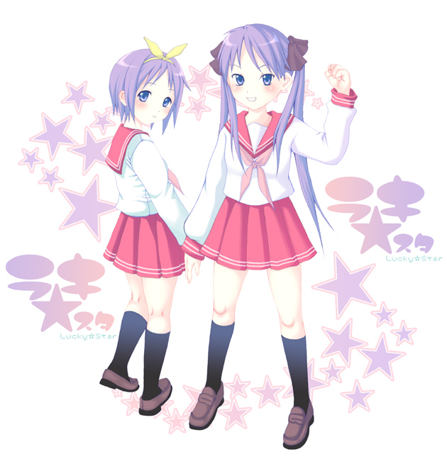 00s 2girls black_socks blue_eyes blue_hair bow brown_shoes clenched_hand copyright_name female_focus full_body grin hair_bow hairband hiiragi_kagami hiiragi_tsukasa looking_at_viewer lucky_star multiple_girls neuron_(exceed) purple_hair raised_fist ryouou_school_uniform school_uniform serafuku shoes short_hair siblings sisters skirt smile socks standing star_(symbol) twins twintails