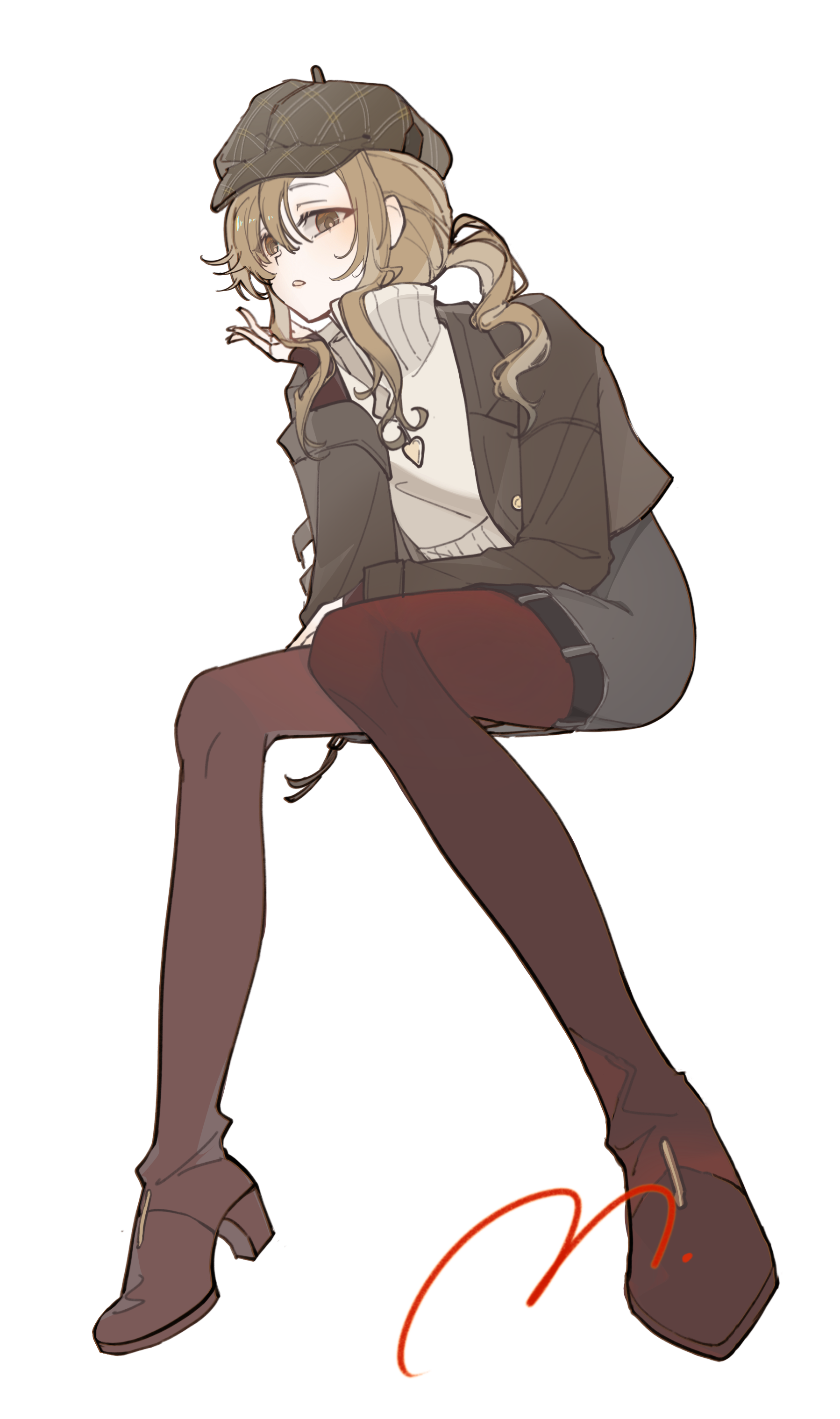 1girl :o absurdres arm_on_thigh brown_eyes brown_hair brown_hat brown_jacket newsboy_cap full_body grey_skirt hand_up hat highres invisible_chair jacket long_hair long_sleeves looking_at_viewer melania_(reverse:1999) miniskirt open_clothes open_jacket pantyhose pencil_skirt ponytail red_footwear red_pantyhose reverse:1999 sitting skirt solo sweater tansuangai_fenmo turtleneck turtleneck_sweater white_background white_sweater