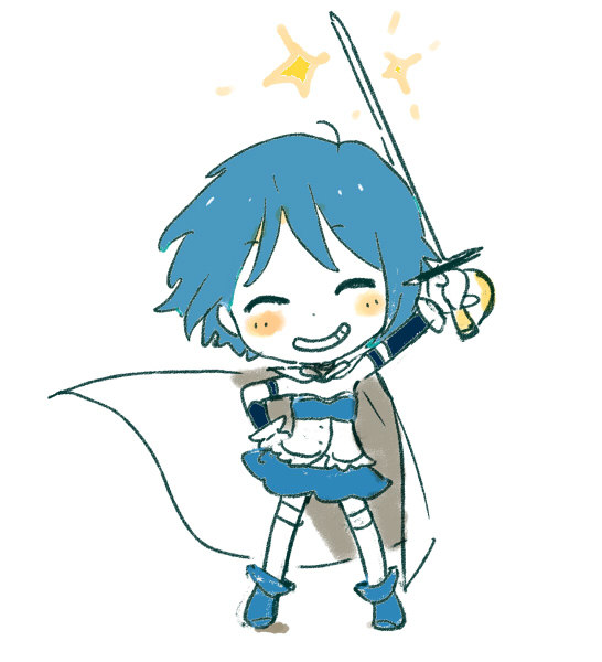 ^_^ arm_up bad_id bad_tumblr_id blue_boots blue_hair blue_skirt blush_stickers boots cape chibi chibi_only closed_eyes detached_sleeves full_body gloves hand_on_own_hip holding holding_sword holding_weapon kiikanna magical_girl mahou_shoujo_madoka_magica mahou_shoujo_madoka_magica_(anime) miki_sayaka miki_sayaka_(magical_girl) short_hair simple_background skirt smile sparkle standing sword teeth weapon white_background white_cape white_gloves