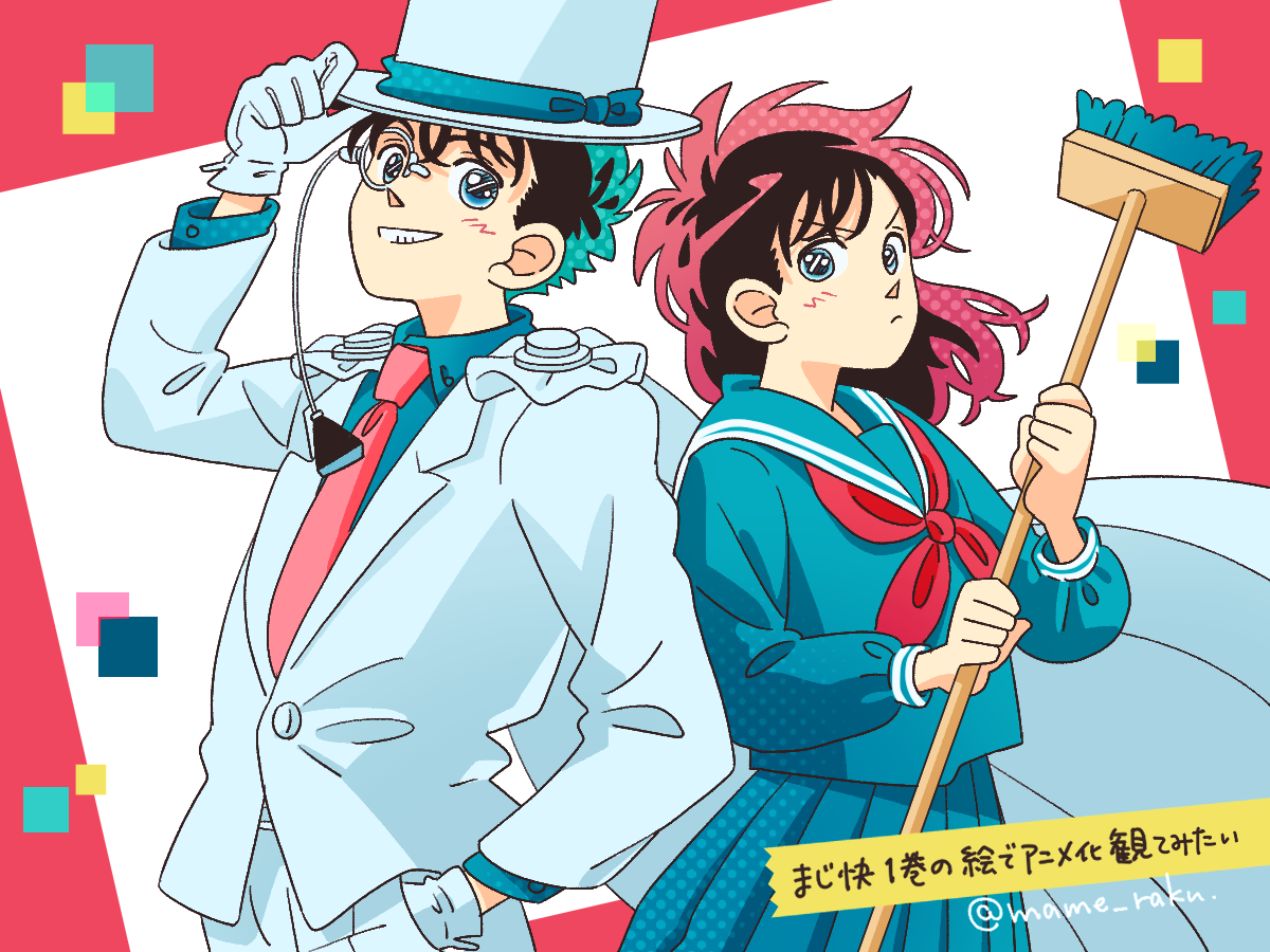 1980s_(style) 1boy 1girl aoyama_goushou_(style) black_hair blue_eyes blue_shirt border broom brown_hair cape commentary_request cowboy_shot floating_clothes floating_hair formal_clothes frown gloves grin hand_in_pocket hat hat_tip holding holding_broom kaitou_kid looking_at_viewer magic_kaito maro_mayuge medium_hair monocle monocle_chain nakamori_aoko necktie oldschool pink_necktie pleated_skirt red_border retro_artstyle sailor_collar sailor_shirt school_uniform shirt short_hair skirt smile suit top_hat translation_request twitter_username white_cape white_gloves white_hat white_suit