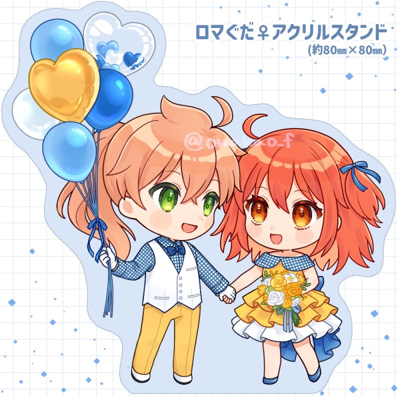 1boy 1girl :d ahoge artist_name balloon blue_bow blue_bowtie blue_footwear blue_ribbon blue_shirt bouquet bow bowtie chibi collared_shirt colored_eyelashes commentary_request couple dot_nose dress fate/grand_order fate_(series) flower fujimaru_ritsuka_(female) full_body gloves green_eyes hair_between_eyes hair_ribbon heart_balloon hetero holding holding_balloon holding_bouquet holding_flower holding_hands layered_dress long_hair long_sleeves looking_at_another merchandise_available off-shoulder_dress off_shoulder one_side_up open_mouth orange_dress orange_eyes orange_flower orange_hair orange_rose pants ponytail ribbon romani_archaman rose shirt shoes sleeveless sleeveless_dress smile standing traditional_bowtie twitter_username vest waka_(owakao_f) white_flower white_footwear white_gloves white_rose white_vest wing_collar yellow_flower yellow_pants yellow_rose