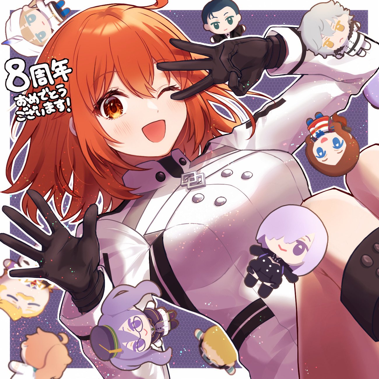 1girl :d ;d ahoge anniversary black_boots black_gloves boots border captain_nemo_(fate) chaldea_logo character_doll commentary_request doll dress fate/grand_order fate_(series) finger_counting fujimaru_ritsuka_(female) fujimaru_ritsuka_(female)_(decisive_battle_chaldea_uniform) gloves goredolf_musik hair_between_eyes hands_up high_collar highres jingle_abel_meuniere kadoc_zemlupus knee_boots knees_up leonardo_da_vinci_(fate) leonardo_da_vinci_(fate/grand_order) leonardo_da_vinci_(rider)_(fate) leonardo_da_vinci_(rider)_(first_ascension)_(fate) light_particles long_sleeves looking_at_viewer mash_kyrielight medium_hair nemo_(fate) one_eye_closed open_mouth orange_eyes orange_hair outline outside_border purple_background romani_archaman sherlock_holmes_(fate) shoes simple_background sion_eltnam_(type-moon) sion_eltnam_sokaris smile solo stuffed_toy waka_(owakao_f) white_border white_dress white_outline
