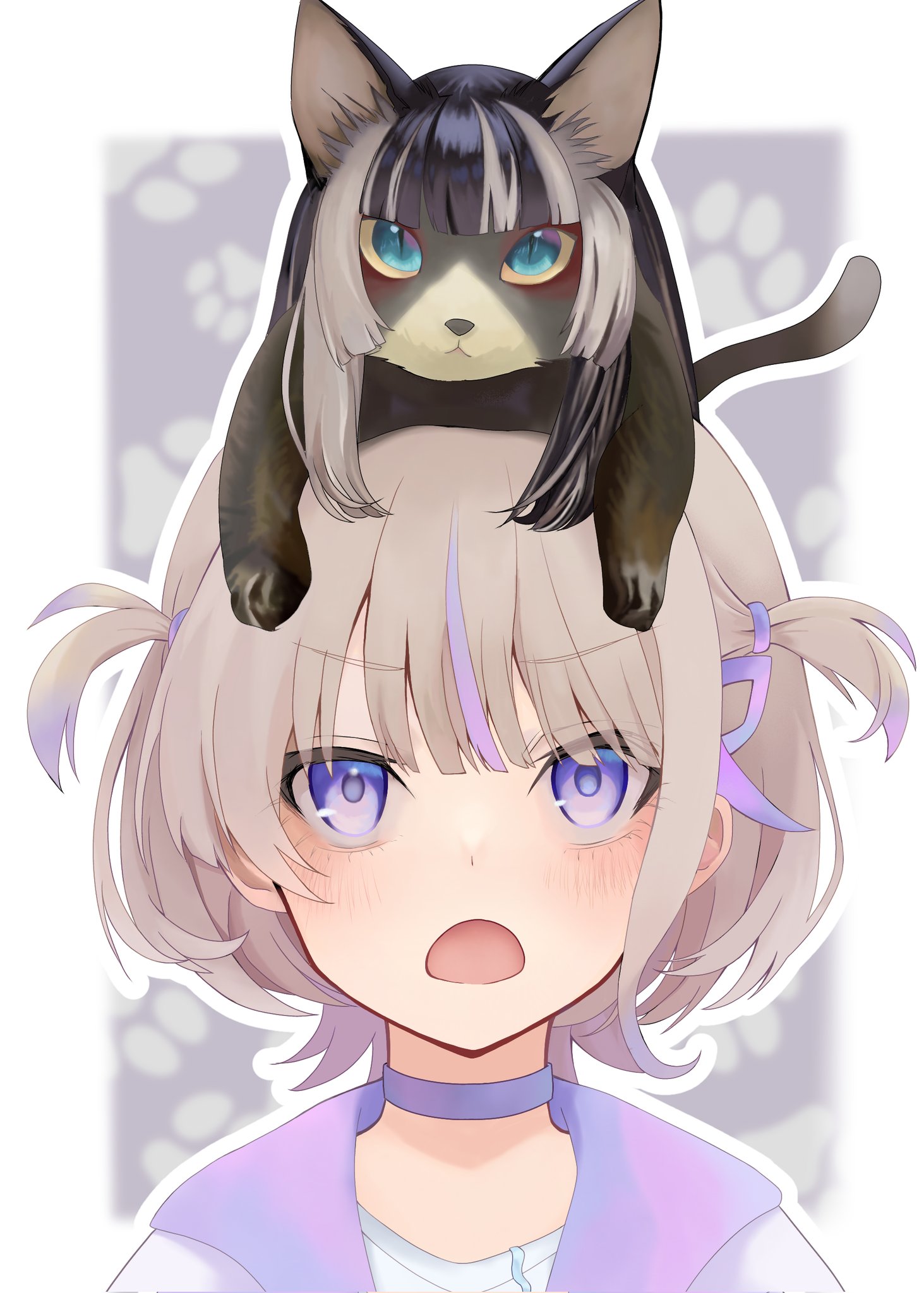1girl animal animal_on_head animalization blonde_hair cat cat_on_head choker commentary english_commentary highres hololive hololive_dev_is jacket juufuutei_raden on_head purple_choker purple_eyes purple_jacket todoroki_hajime todoroki_hajime_(1st_costume) two_side_up virtual_youtuber vx60753069