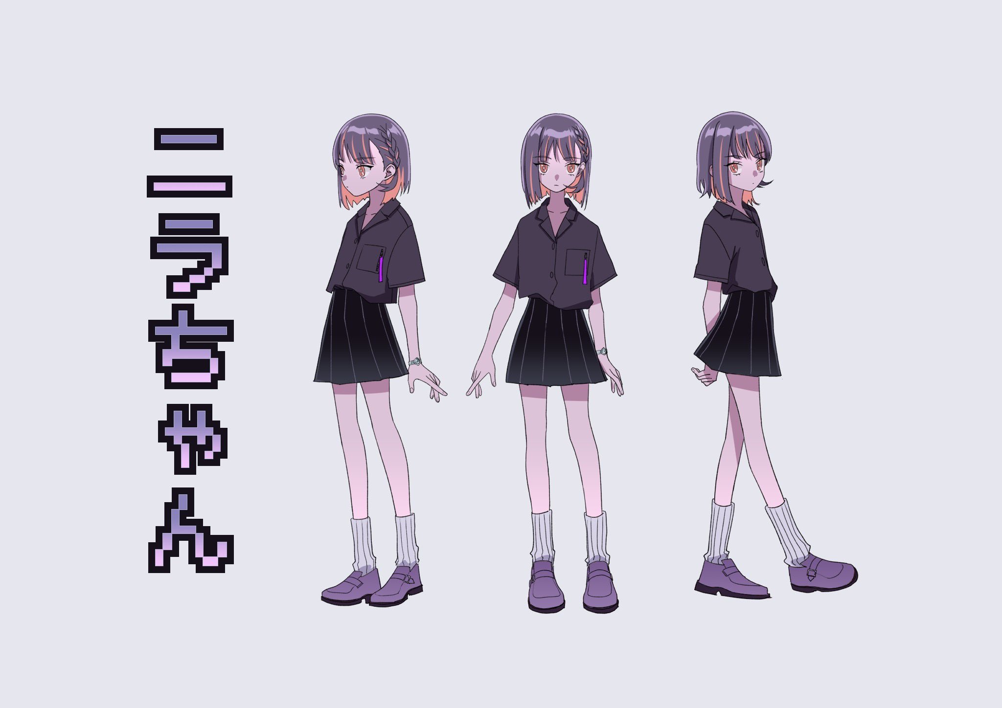 3girls anime_coloring ankle_socks arms_at_sides arms_behind_back black_collar black_shirt black_skirt black_sleeves blunt_ends bob_cut braid breast_pocket bright_pupils buttons character_name reference_sheet collar collarbone collared_shirt commentary concept_art dress_shirt dual_persona expressionless eyelashes facing_viewer from_side gradient_clothes gradient_skirt hair_behind_ear highres loafers looking_at_viewer miniskirt mirror_tune_(zutomayo) multiple_girls multiple_views myon_(tokipi) nira-chan nira-chan_(mirror_tune)_(zutomayo) object_in_pocket official_art orange_eyes pen_in_pocket pink_hair pleated_skirt pocket production_art purple_footwear purple_hair second-party_source shirt shirt_tucked_in shoes short_hair short_sleeves side_braid simple_background skirt socks standing standing_on_one_leg translated tube_socks turnaround watch white_background white_pupils white_socks wing_collar wristwatch zutto_mayonaka_de_ii_no_ni