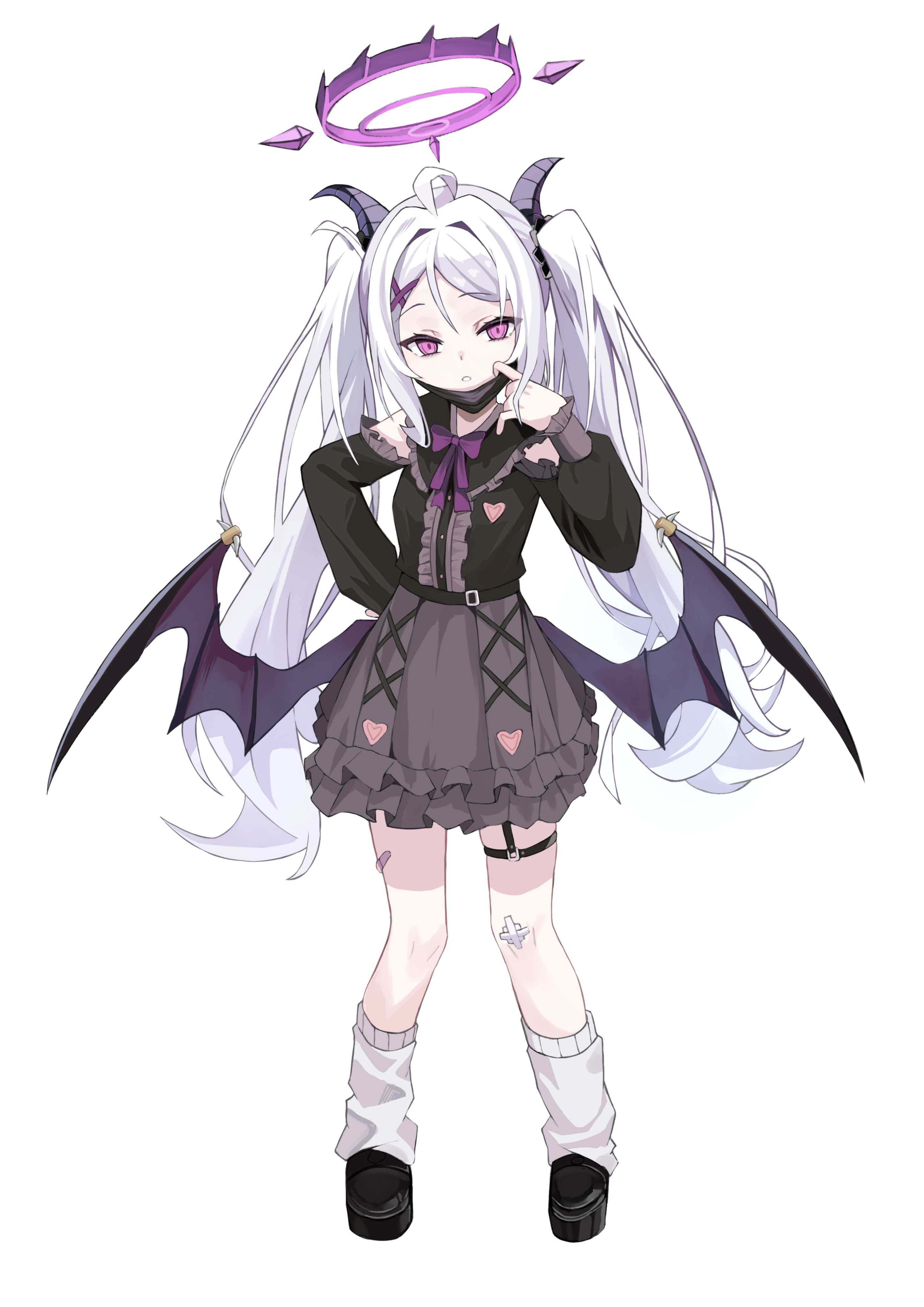 1girl absurdres ahoge alternate_costume alternate_hairstyle bandaid_on_thigh black_mask black_shirt black_shoes blue_archive center_frills chun_jiang demon_girl demon_horns demon_wings frilled_skirt frills full_body gauze gauze_on_knee grey_skirt hair_ornament halo hand_on_own_hip highres hina_(blue_archive) horns jirai_kei long_hair long_sleeves looking_at_viewer loose_socks low_wings mask mask_pull mouth_mask purple_eyes shirt shoes simple_background skirt socks solo twintails white_background white_hair white_socks wings x_hair_ornament