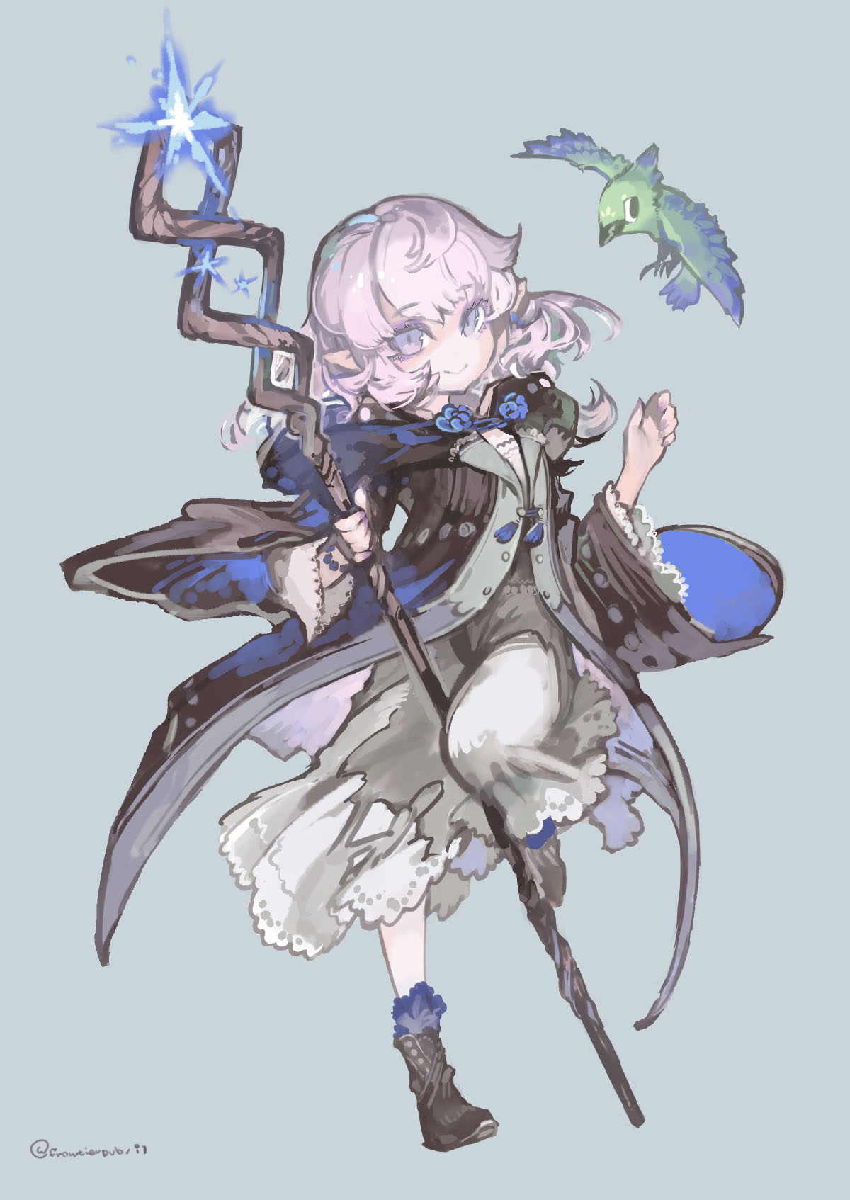 1girl bird elf fantasy highres holding holding_staff konno_takashi long_hair magic original pink_eyes pink_hair pointy_ears robe simple_background staff standing standing_on_one_leg wizard