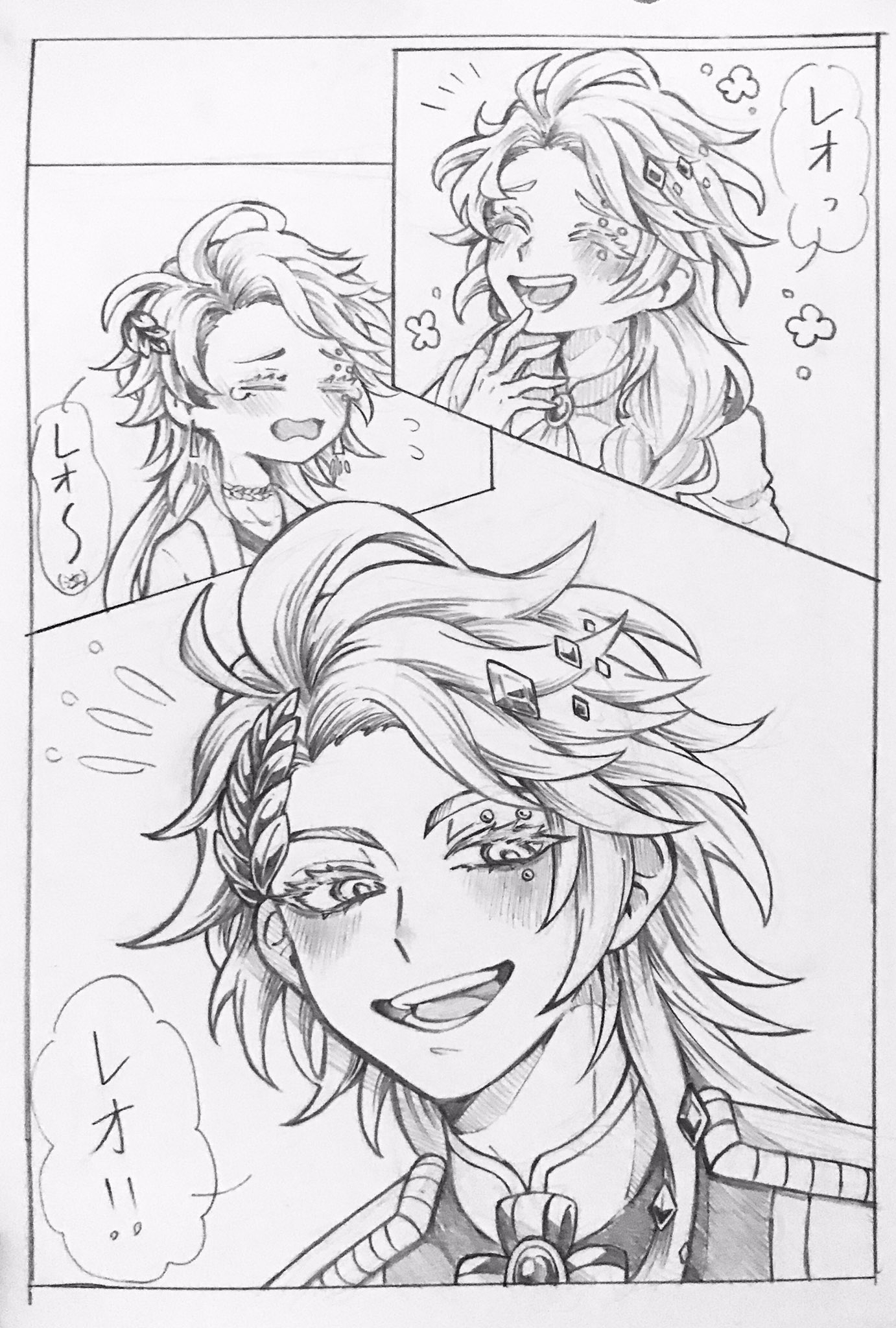 1boy apollo_(shuumatsu_no_valkyrie) blush brooch diamond_(gemstone) diamond_(shape) diamond_hair_ornament flying_sweatdrops from_side greyscale hand_up happy high_collar highres hojicha jewelry laughing laurel_crown laurel_wreath long_hair looking_at_viewer male_focus monochrome multiple_views open_mouth shuumatsu_no_valkyrie smile speech_bubble tearing_up teeth translation_request upper_body vest wreath