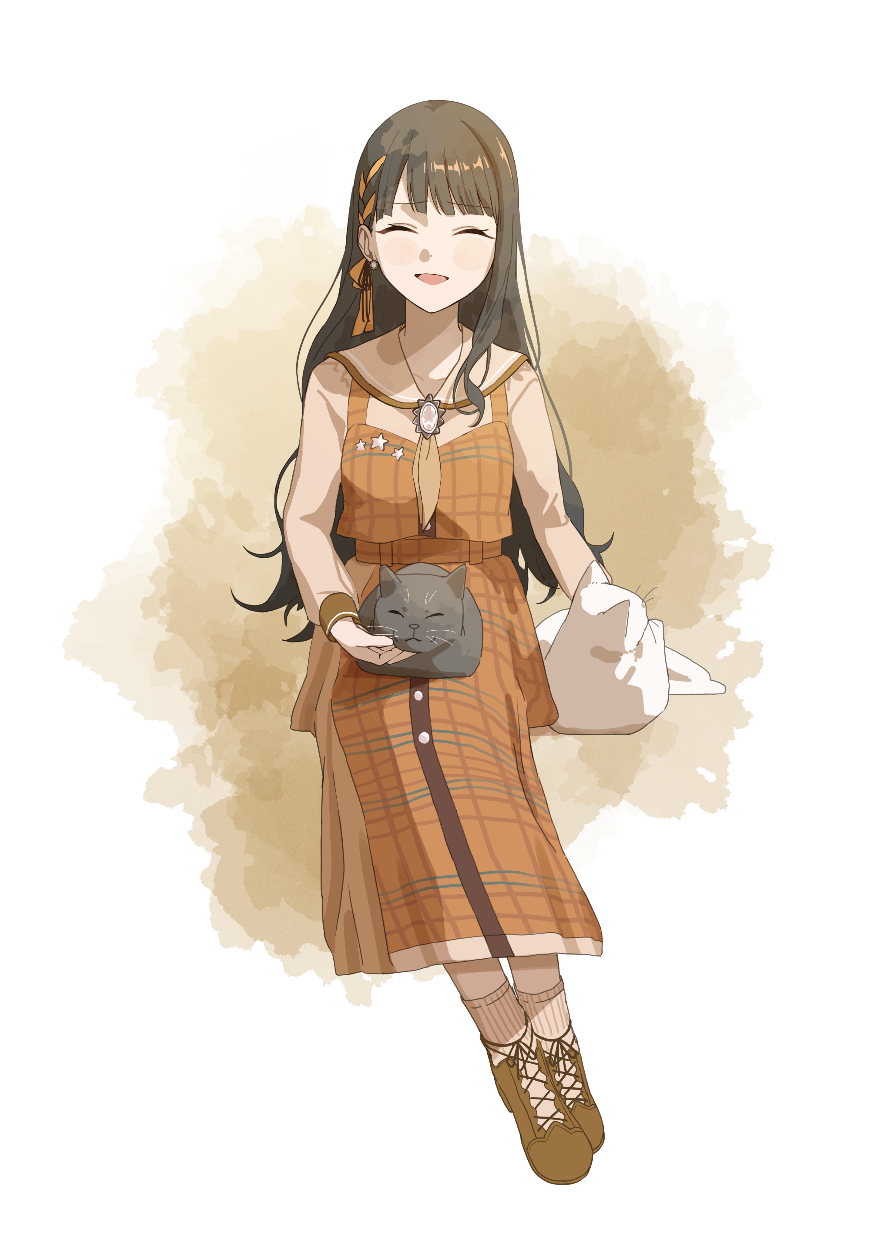 1girl absurdres animal animal_on_lap black_cat black_hair blunt_bangs brown_dress brown_footwear brown_neckerchief brown_ribbon brown_sailor_collar brown_shirt cat closed_eyes cross-laced_footwear dress gem hair_ribbon happy_enjoy_music!_(project_sekai) hashtag-only_commentary highres hoshino_ichika_(project_sekai) isana_999 jewelry neckerchief official_alternate_costume official_alternate_hair_length official_alternate_hairstyle on_lap open_mouth pendant pinafore_dress project_sekai ribbon sailor_collar shirt sleeveless sleeveless_dress smile socks solo white_cat white_gem
