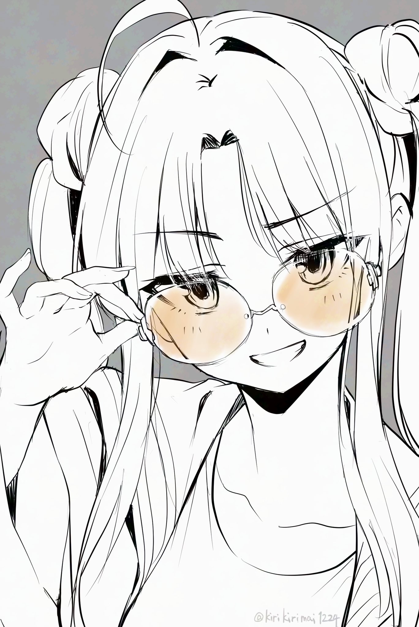 1girl adjusting_eyewear ahoge awa_subaru brown-tinted_eyewear collarbone commentary curtained_hair double_bun girls_band_cry glasses grey_background grin hair_bun hair_intakes highres jacket kirikirimai_(kkm) long_sidelocks official_alternate_costume official_alternate_hairstyle open_clothes open_jacket parted_bangs raised_eyebrow shirt sidelocks simple_background smile solo spot_color untranslatable_commentary t-shirt tinted_eyewear twitter_username