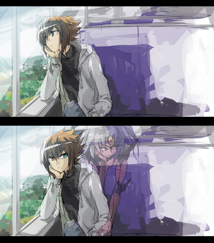 1boy 1other annoyed black_shirt brown_eyes brown_hair crossed_legs denim facial_mark forehead_mark grey_hoodie hand_on_another's_arm hand_on_own_chin heterochromia hood hoodie indoors jeans leaning_to_the_side looking_at_another looking_outside looking_to_the_side moribuden multicolored_hair pants purple_hair shirt two-tone_hair white_hair yu-gi-oh! yu-gi-oh!_gx yubel yuki_judai