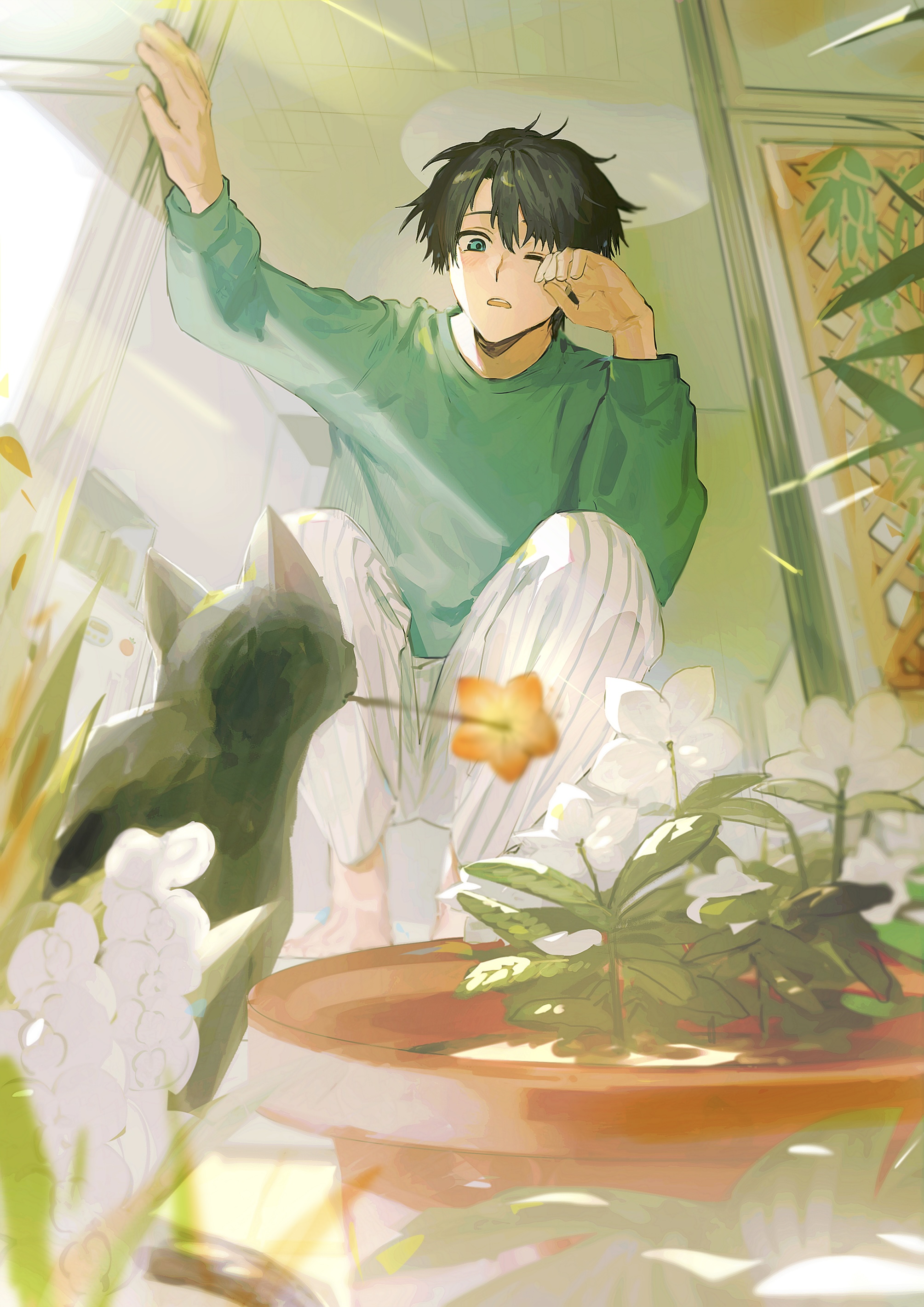 1boy absurdres animal arm_up barefoot black_cat black_hair blue_eyes cat commentary_request crew_neck flower flower_in_mouth green_shirt hair_between_eyes highres kneeling leaf light_rays long_sleeves looking_at_animal male_focus one_eye_closed open_window_shutter orange_flower original pants parted_lips plant potted_plant rubbing_eyes shirt short_hair striped_clothes striped_pants sunbeam sunlight vertical-striped_clothes vertical-striped_pants wanosaku white_flower white_pants window window_shutter