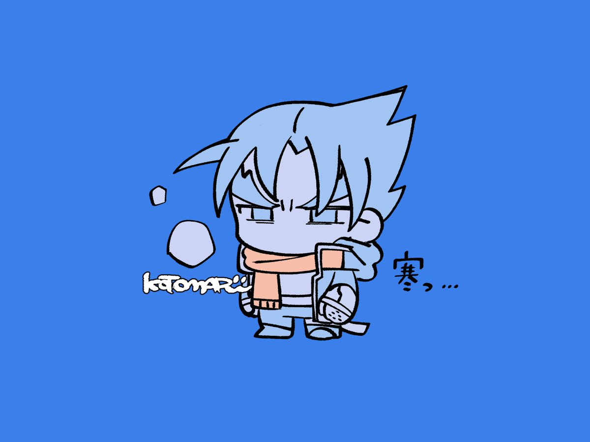 ... 1boy arms_at_sides blue_background blue_theme chibi chibi_only full_body kazama_jin kotomaru_(kotokoto_kottan) male_focus no_mouth scarf short_hair signature simple_background solo studded_gloves tekken translation_request