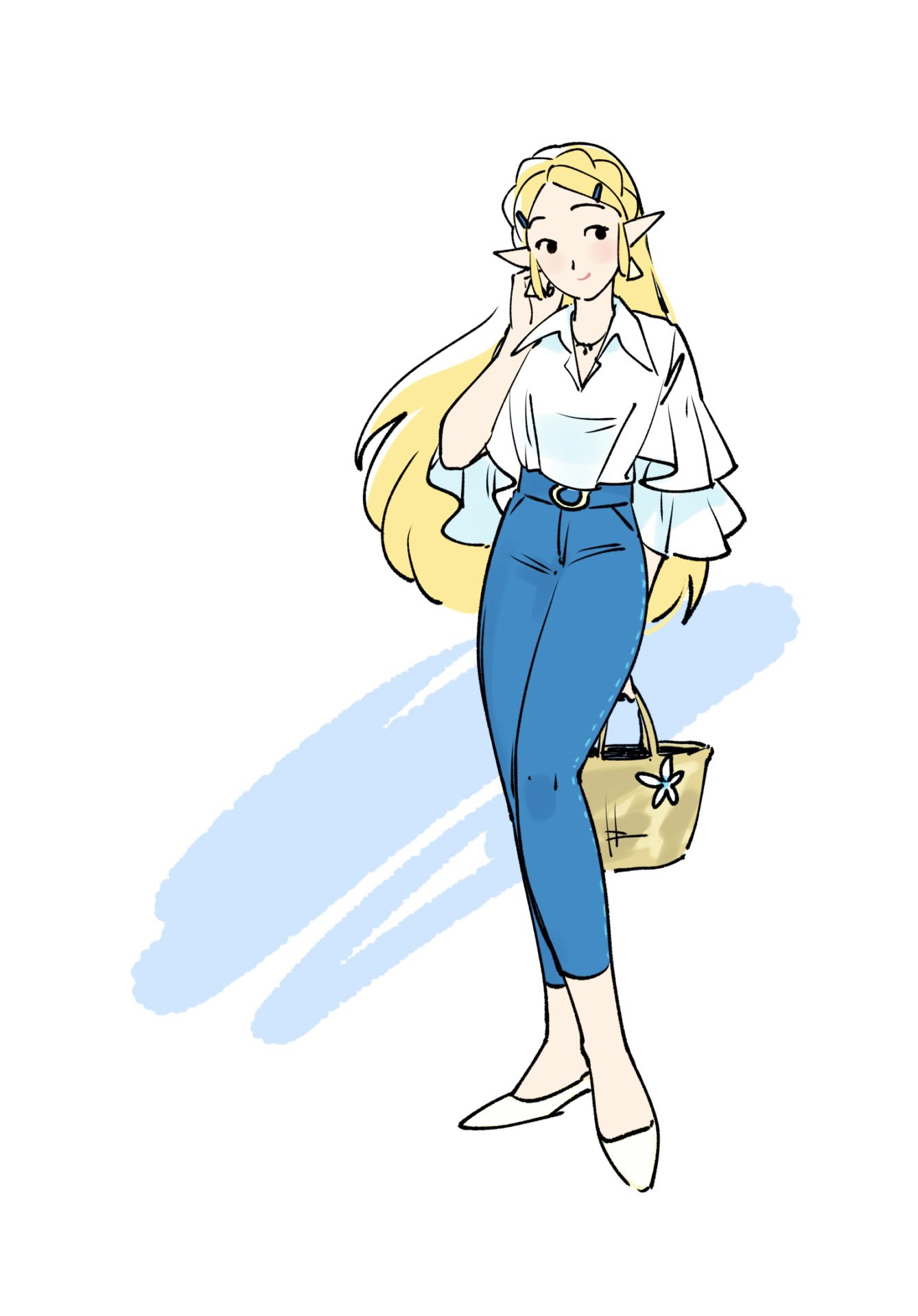 1girl arm_behind_back bag blonde_hair blue_pants braid commentary contemporary crown_braid denim full_body hair_ornament hairclip hashtag-only_commentary highres holding holding_bag jeans jewelry long_hair looking_at_viewer necklace nintendo pants pointy_ears princess_zelda shirt solo standing the_legend_of_zelda the_legend_of_zelda:_breath_of_the_wild tkdnlerkdtpfsut white_footwear white_shirt wide_sleeves