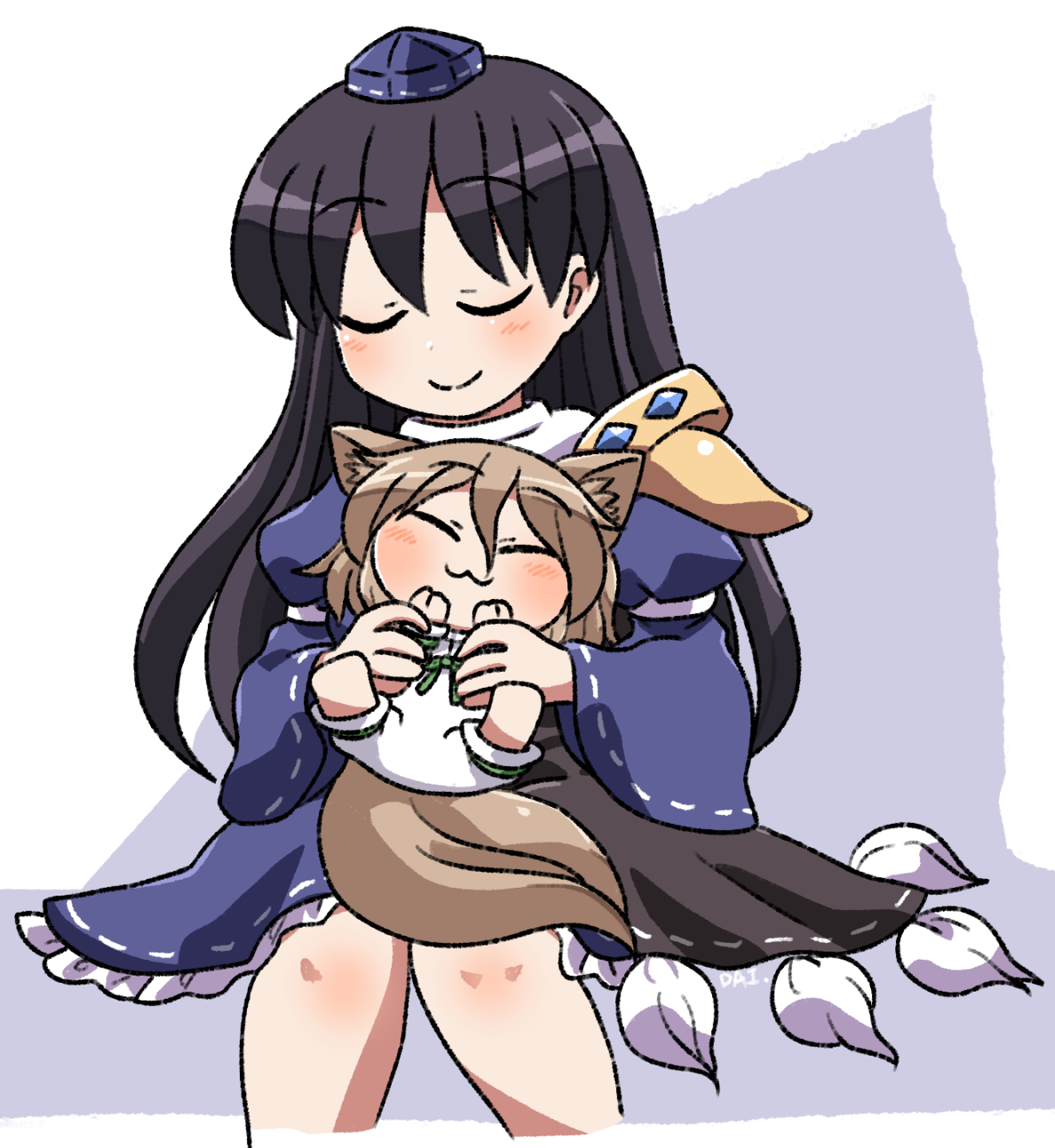 2girls :3 animal_ear_fluff animal_ears barefoot black_coat blonde_hair blue_dress blue_gem blue_hair blue_hat blush closed_eyes closed_mouth coat commentary_request dress feet_out_of_frame fox_ears fox_girl fox_tail frilled_dress frills gem green_ribbon hair_between_eyes hat highres hug iizunamaru_megumu kudamaki_tsukasa long_hair long_sleeves multiple_girls neck_ribbon ribbon ribbon-trimmed_coat ribbon-trimmed_dress ribbon_trim rokugou_daisuke romper short_hair shoulder_guard sitting sleeveless sleeveless_coat smile tail tokin_hat touhou u_u white_romper wide_sleeves