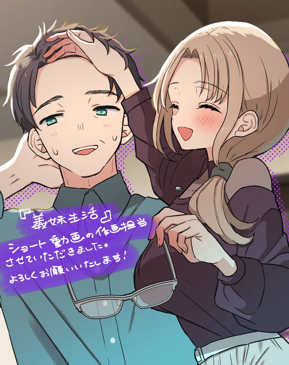 1boy 1girl asamura_taichi averting_eyes ayase_akiko black_hair black_shirt blonde_hair blue_shirt blush breasts closed_eyes collared_shirt commentary_request dress_shirt drop_shadow gimai_seikatsu glasses green_eyes grey-framed_eyewear hand_on_another's_forehead hand_on_own_neck highres holding holding_removed_eyewear husband_and_wife ichi_(iti_iti) large_breasts long_sleeves low_ponytail mature_female mature_male medium_hair open_mouth ponytail shirt short_hair smile sweat translation_request unworn_eyewear upper_body