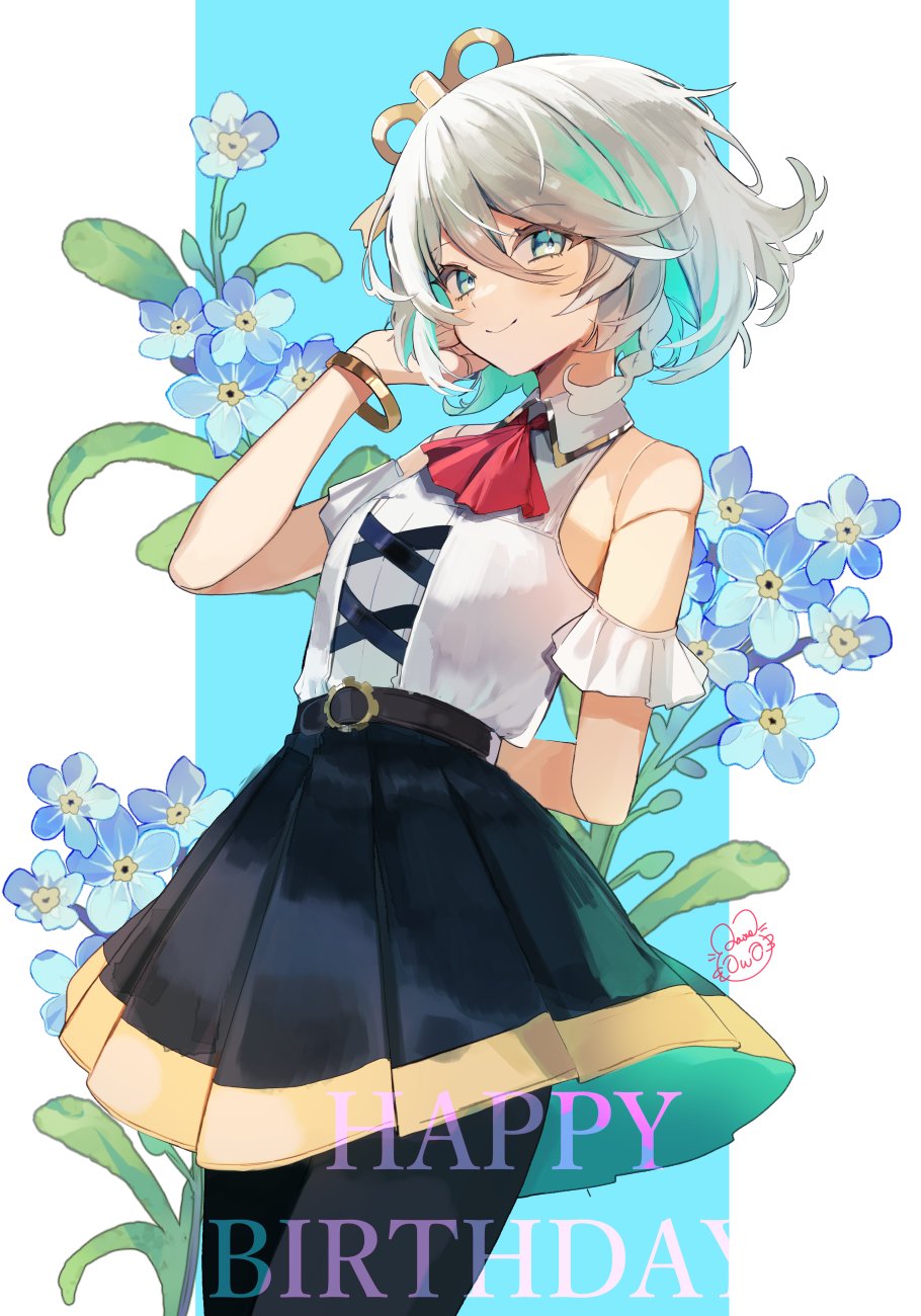 1girl alternate_costume arm_behind_back ascot bare_shoulders black_pantyhose black_skirt blue_flower bracelet cecilia_immergreen closed_mouth commentary doll_joints english_commentary floral_background flower gold_bracelet green_eyes green_hair hair_between_eyes happy_birthday highres hololive hololive_english jewelry joints looking_at_viewer multicolored_hair pantyhose pillarboxed raora_panthera_(artist) red_ascot shirt short_hair skirt smile solo streaked_hair virtual_youtuber white_hair white_shirt