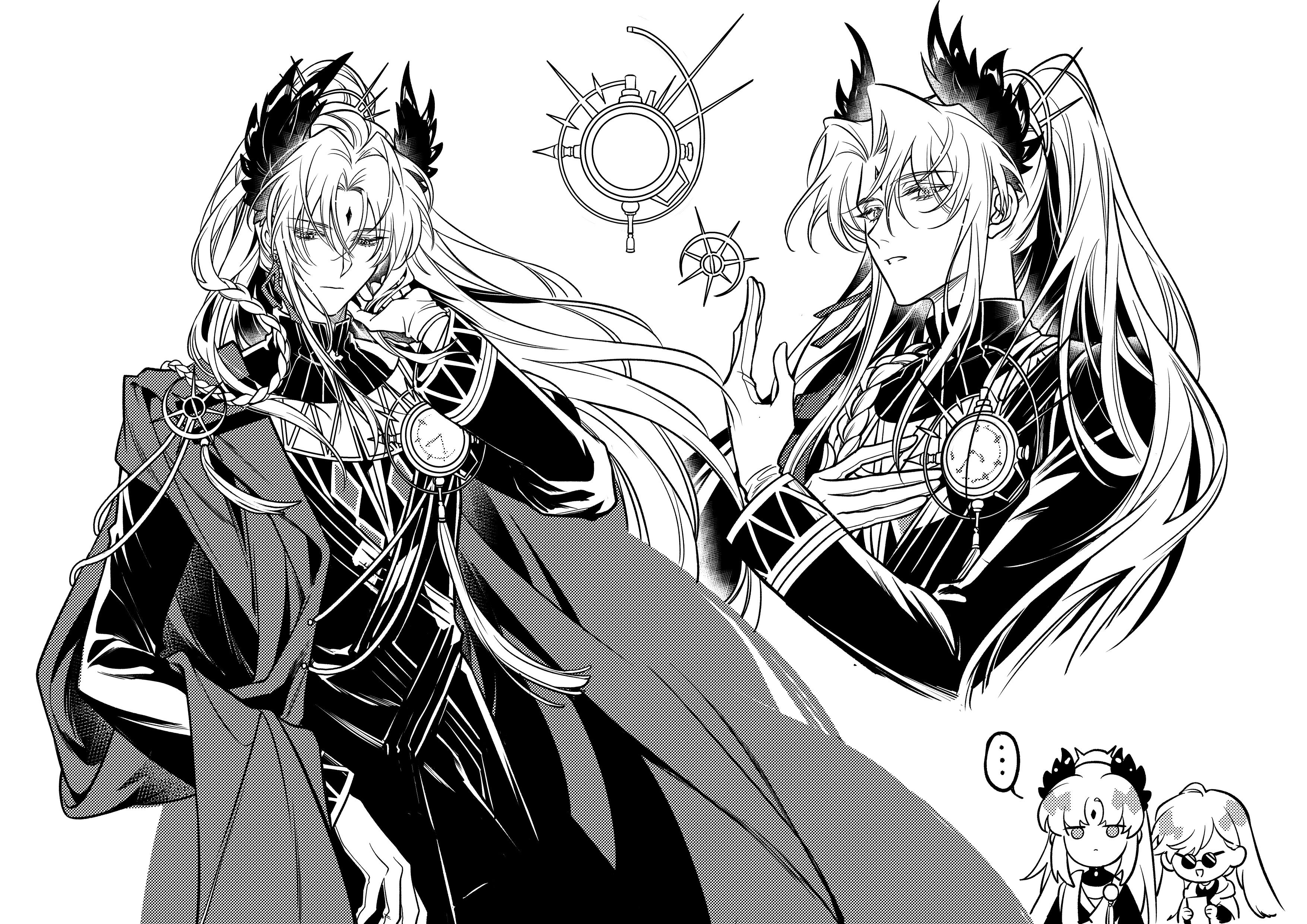 ... 2boys absurdres animal_ears arknights braid chibi chibi_inset closed_mouth curtained_hair expressionless facial_mark floating_clothes floating_hair forehead_mark gloves greyscale hair_intakes hand_up high_ponytail highres liaison_(arknights) long_hair long_sleeves looking_down male_focus monochrome multiple_boys multiple_views official_alternate_costume official_alternate_hairstyle parted_lips passenger_(arknights) passenger_(dream_in_a_moment)_(arknights) ponytail rabbit_boy rabbit_ears round_eyewear side_braid simple_background speech_bubble spoken_ellipsis straight_hair sunglasses white_background yan_yan_zhishi_naicha